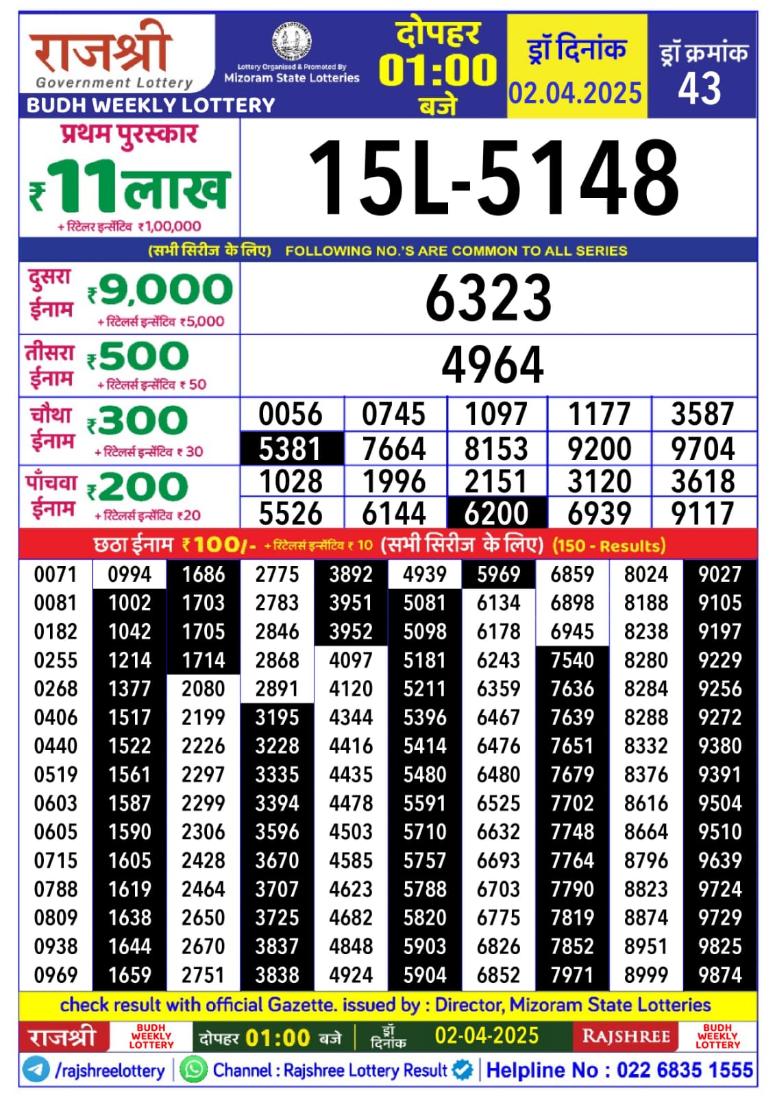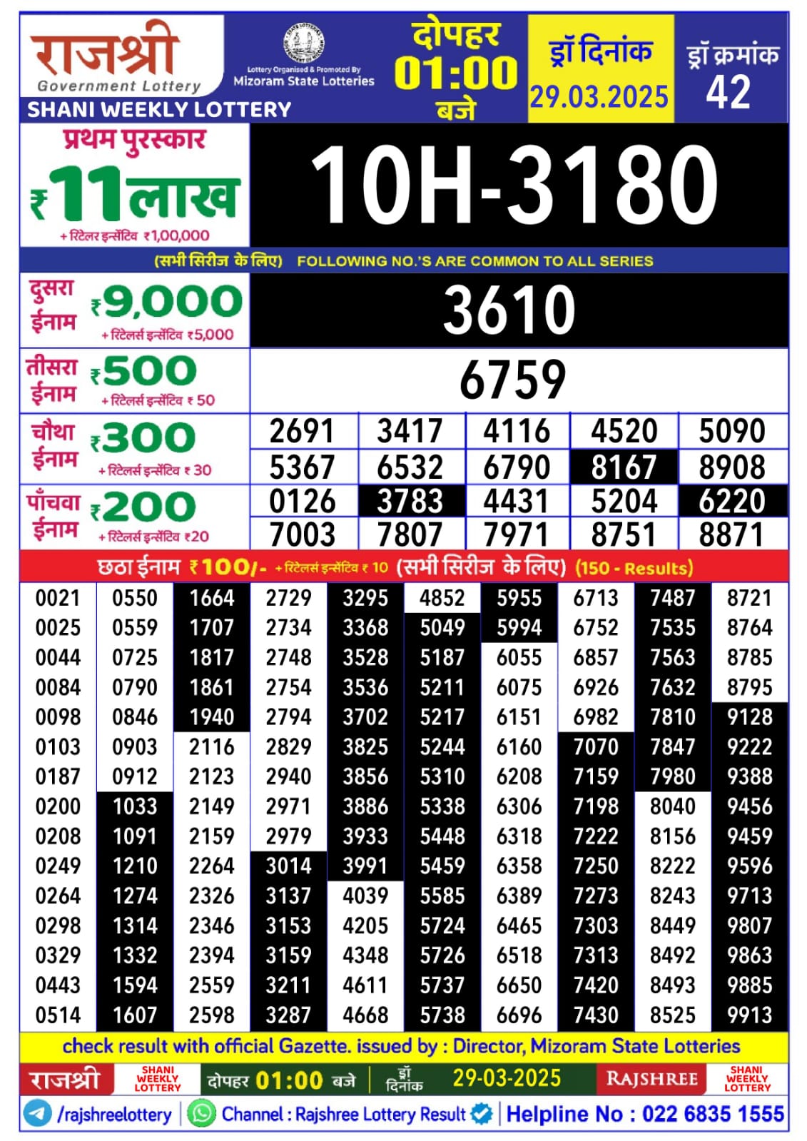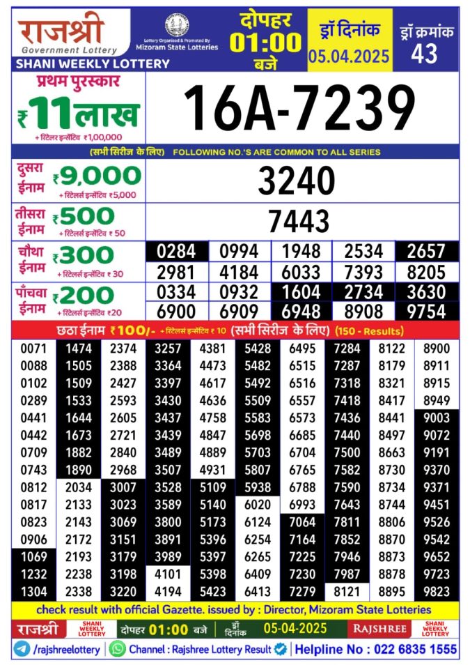 Rajshree Shani Weekly Lottery 1pm Result 15.11.2025