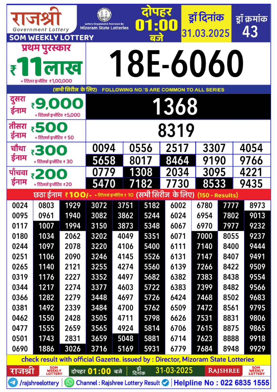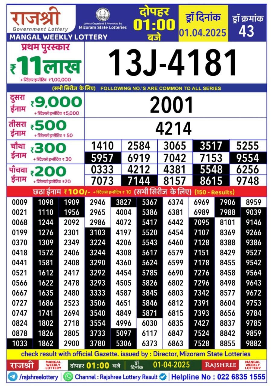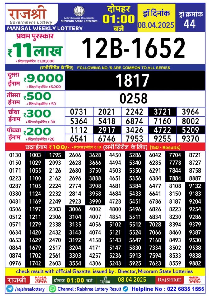 Rajshree Mangal Weekly Lottery 1pm Result 18.11.2025