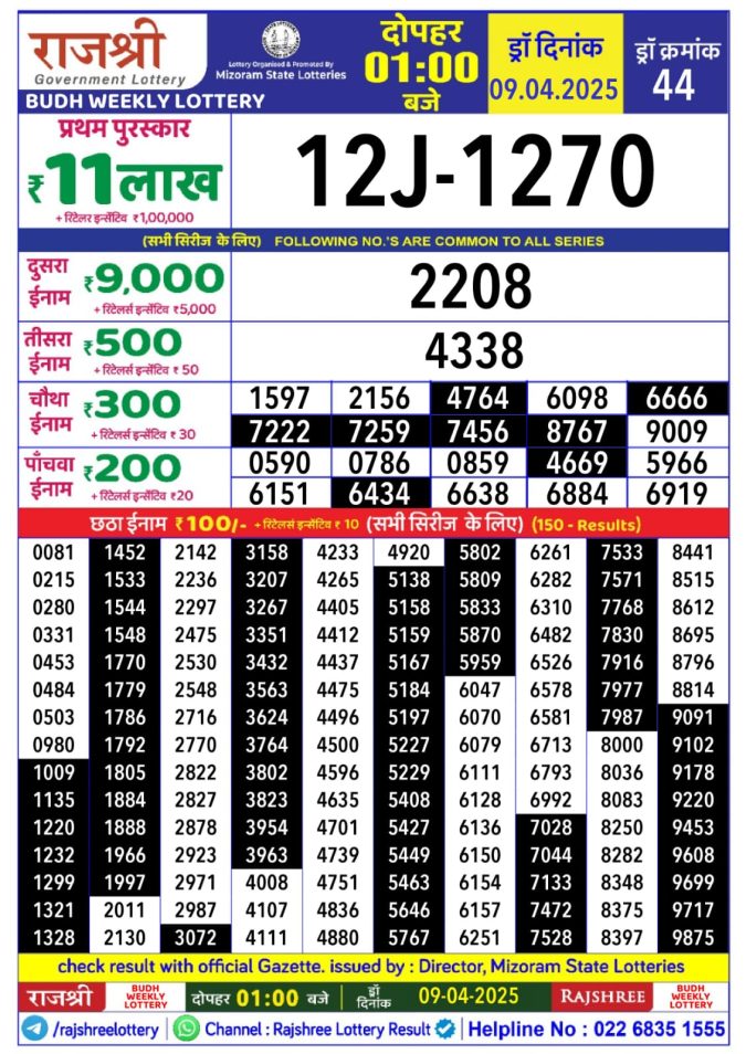 Rajshree Budh Weekly Lottery 1pm Result 19.11.2025