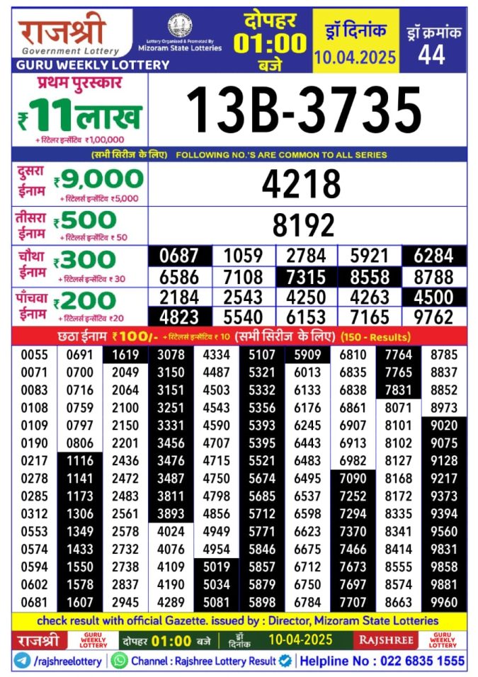 Rajshree Guru Weekly Lottery 1pm Result 13.11.2025