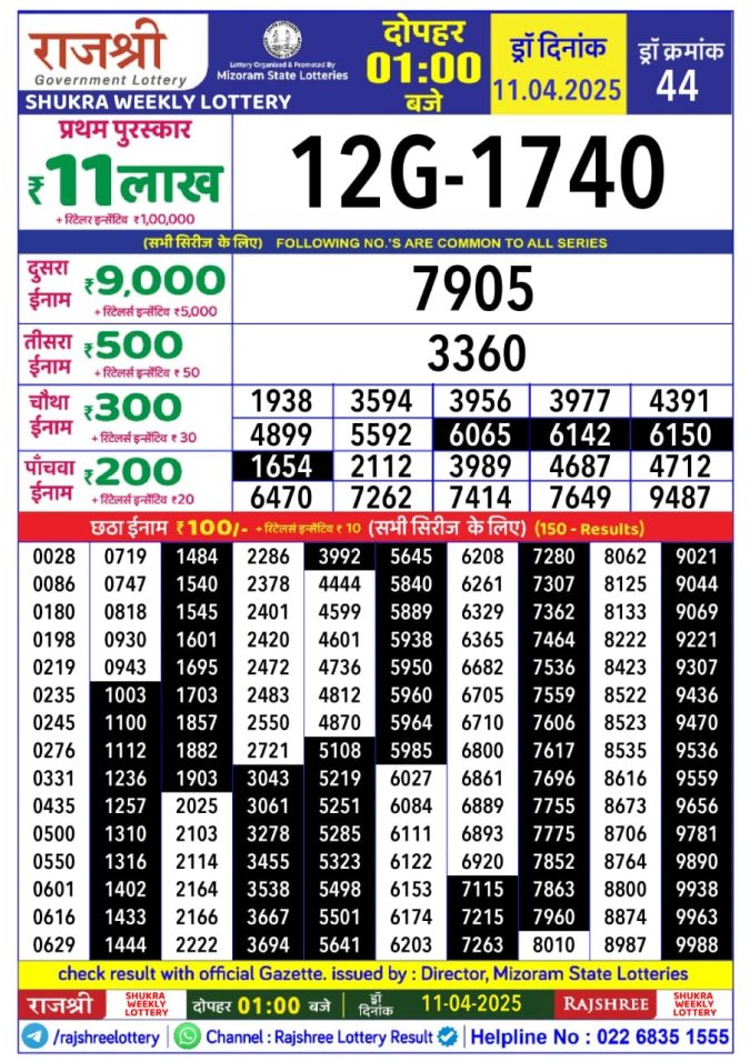 Rajshree Shukra Weekly Lottery 1pm Result 14.11.2025