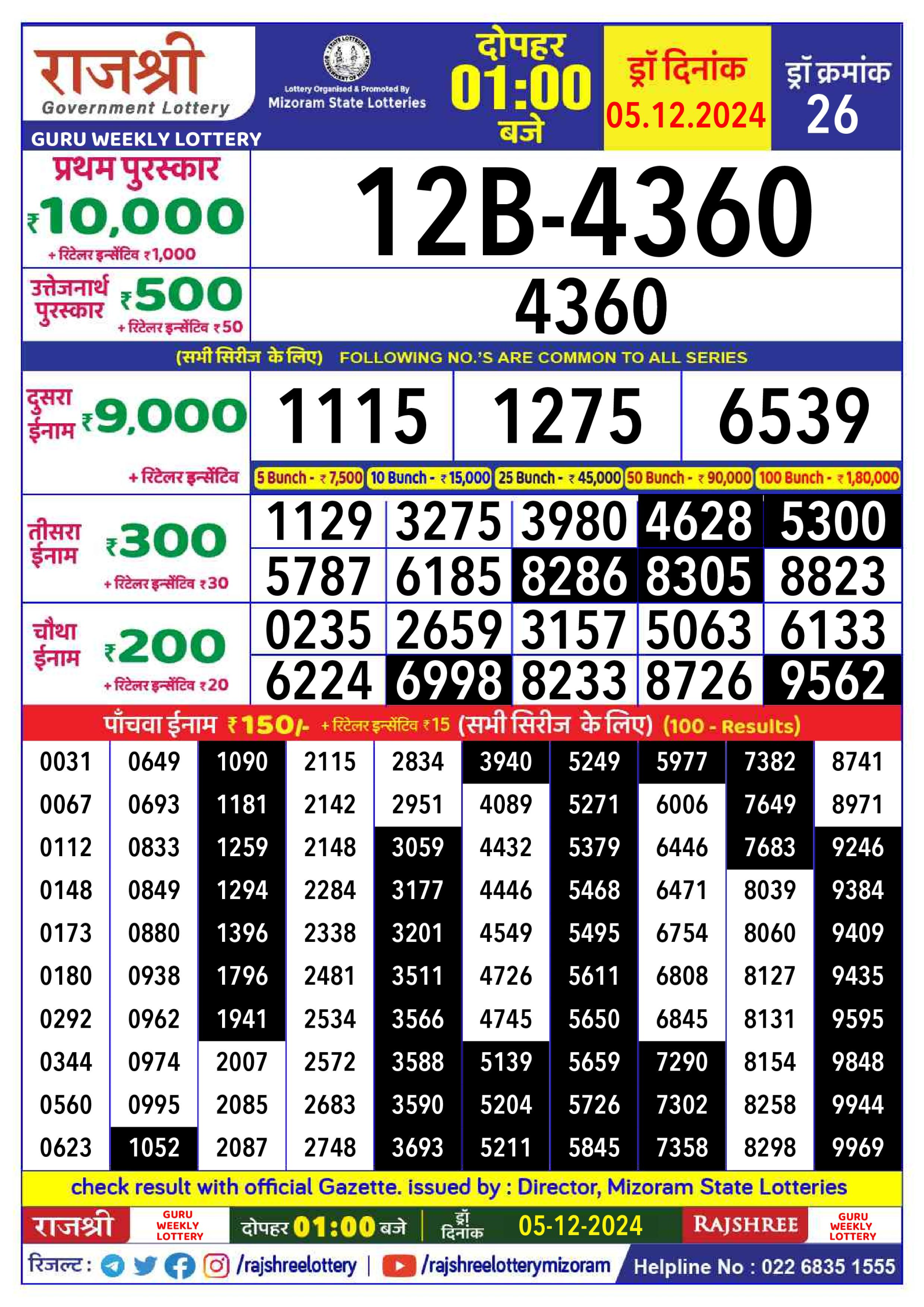 Rajshree Guru Weekly Lottery 1PM Result 24.07.2025