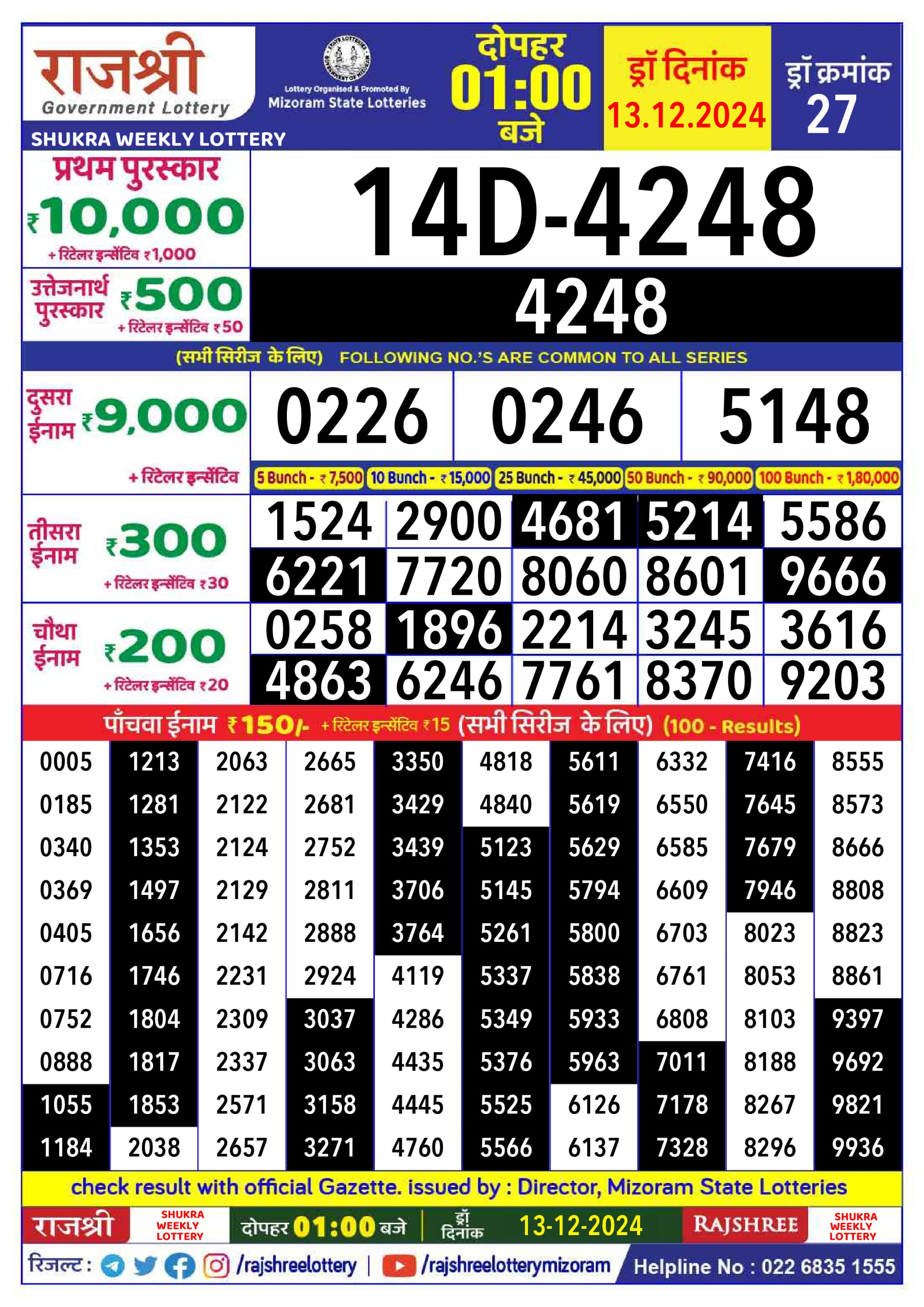 Rajshree shukra Weekly Lottery 1PM Result 25.07.2025