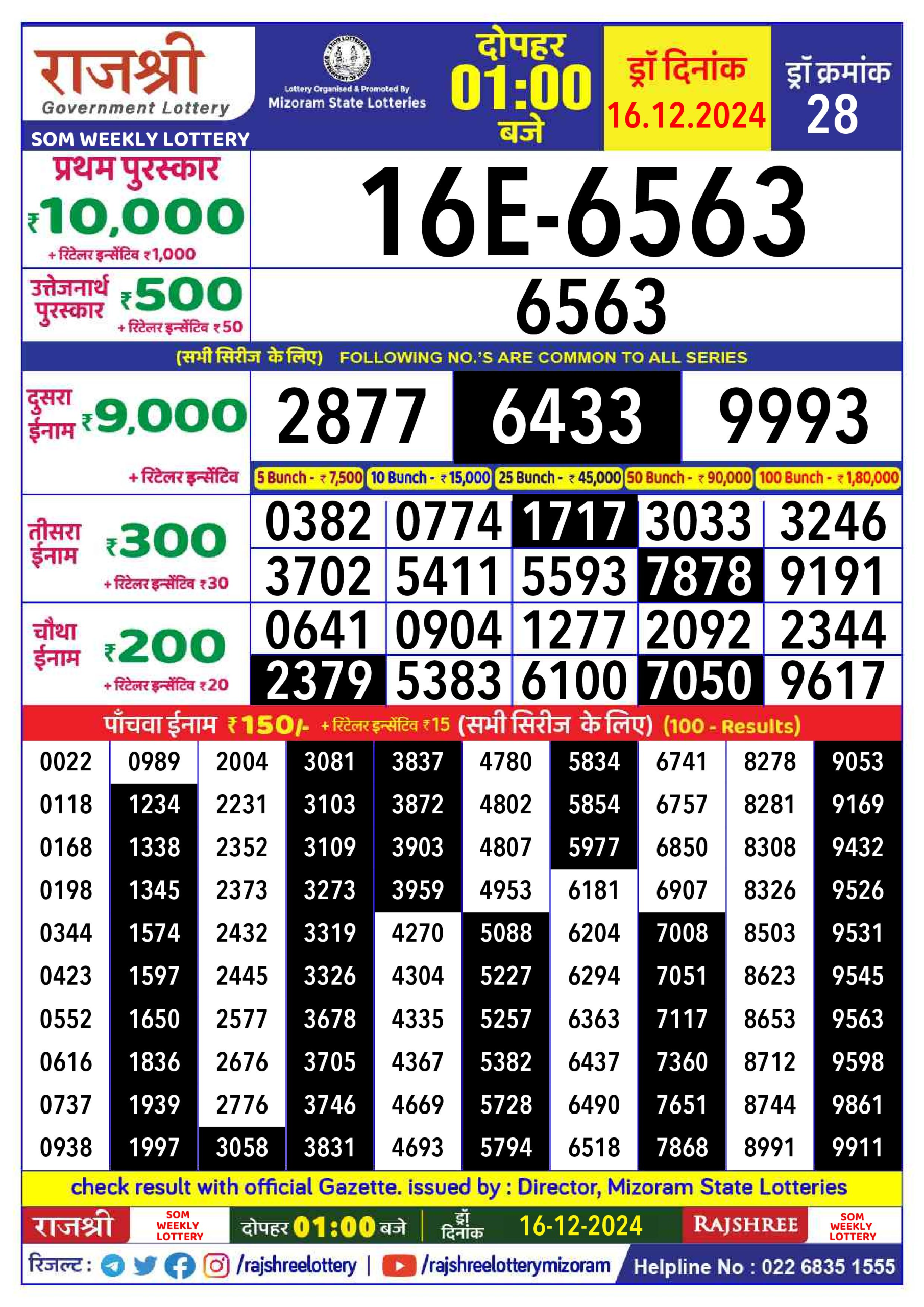 Rajshree som Weekly Lottery 1PM Result 28.07.2025