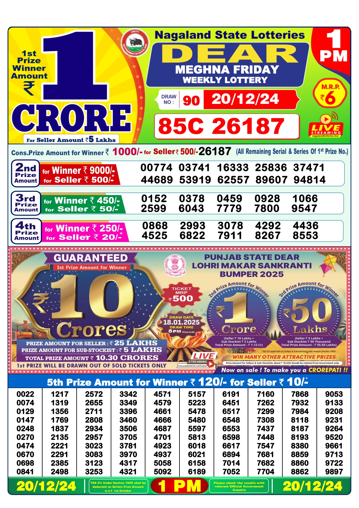 Dear Mehgna Friday Weekly 1pm Result 01.08.2025