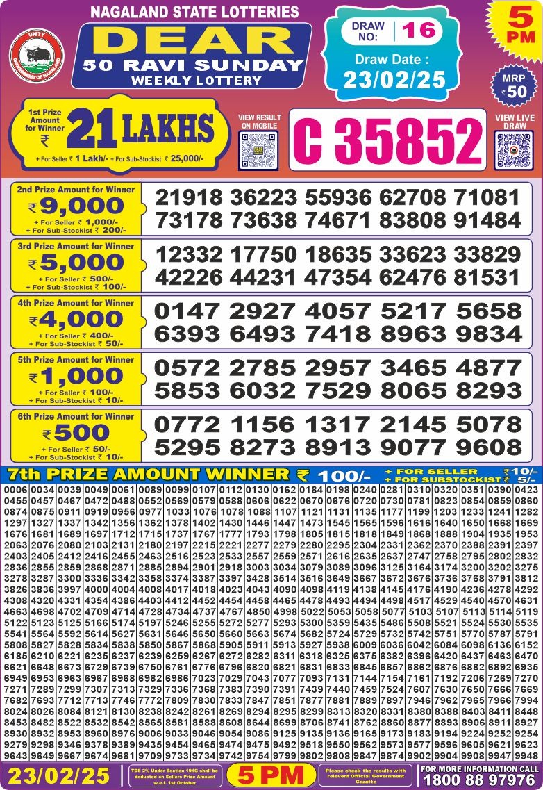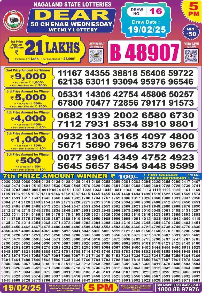 Dear 50 Chenab 5pm Wednesday Lottery Result 16.07.2025