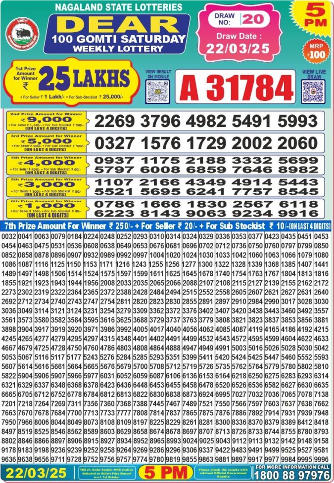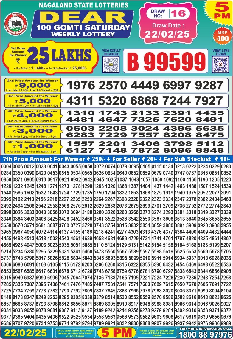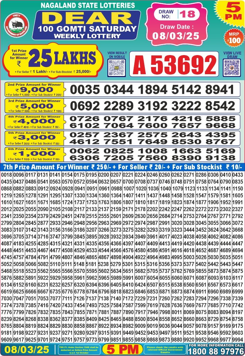 Dear 100 Gomti saturday Lottery 5pm Result  26.07.2025