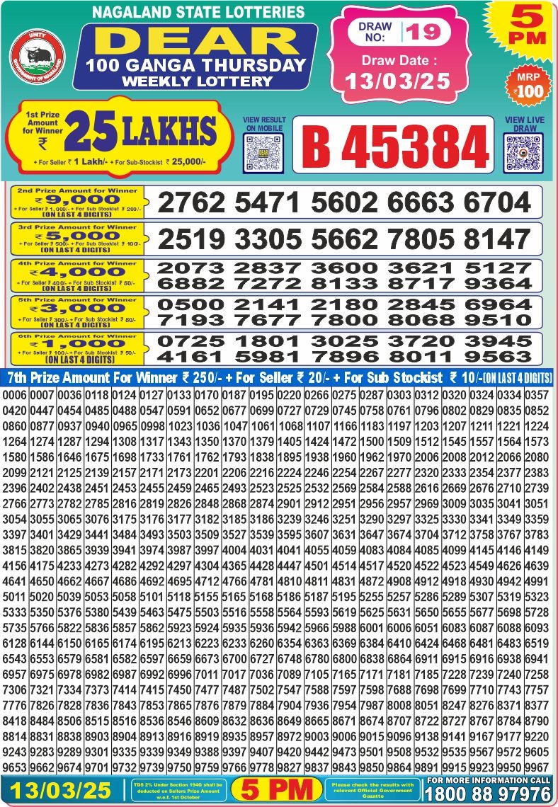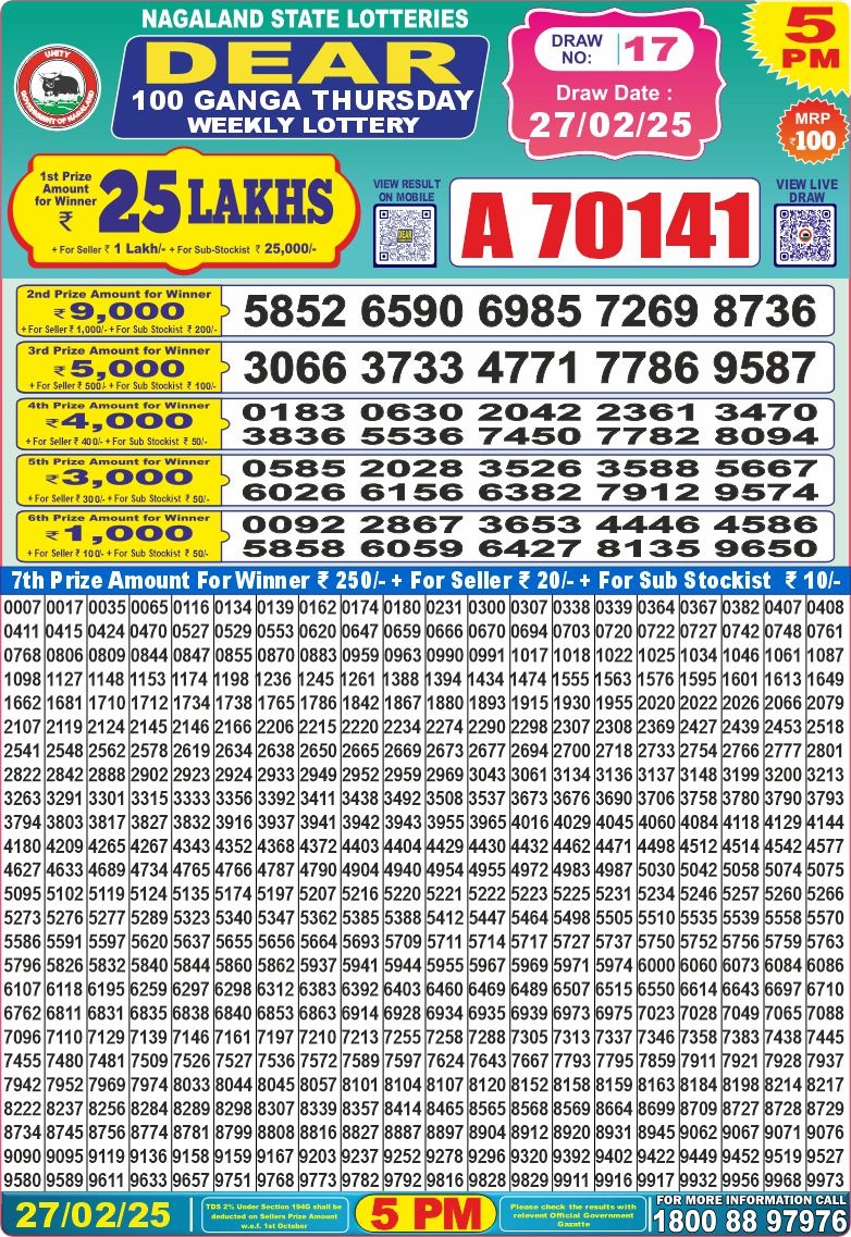 Dear 100 Ganga Thursday Lottery 5pm Result  17.07.2025