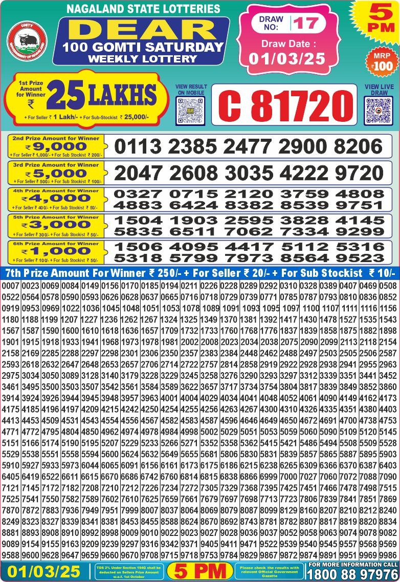 Dear 100 Gomti saturday Lottery 5pm Result  05.07.2025