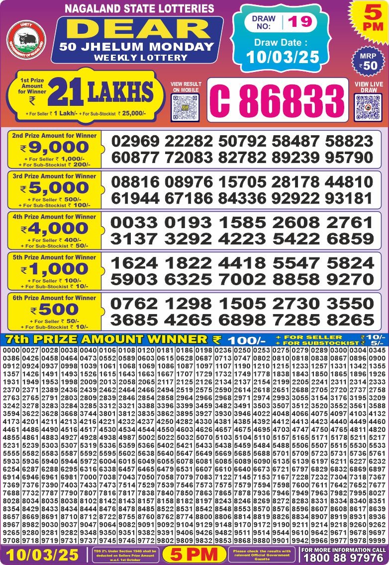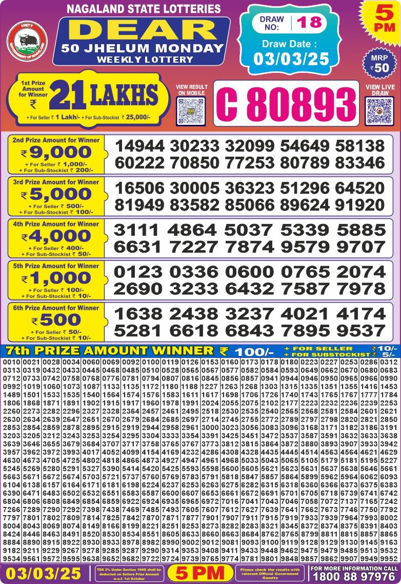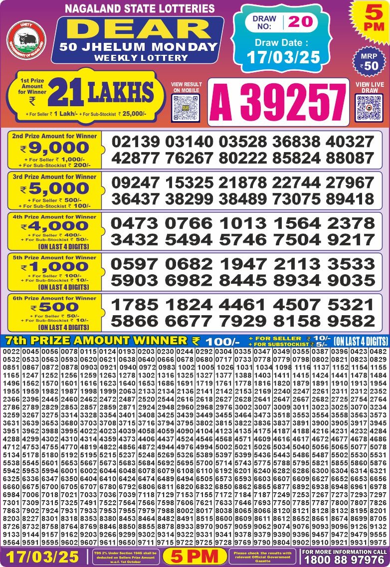 Dear 50 jhelum monday Lottery 5pm Result  21.07.2025