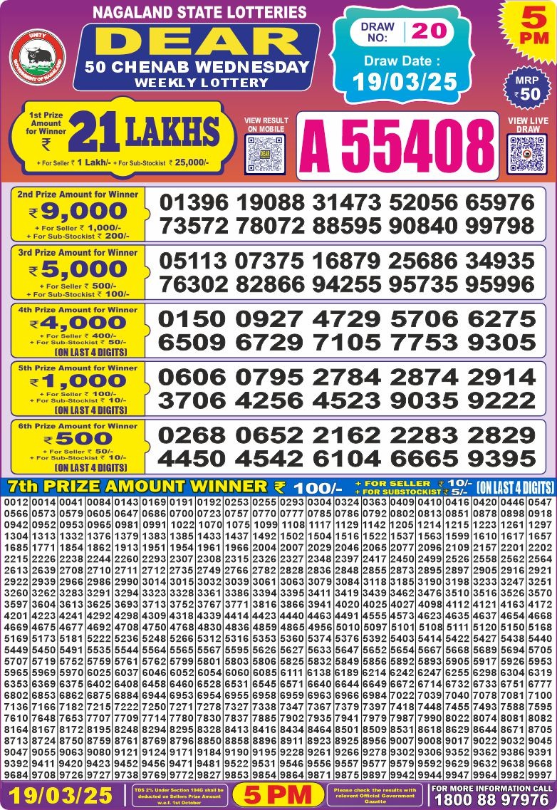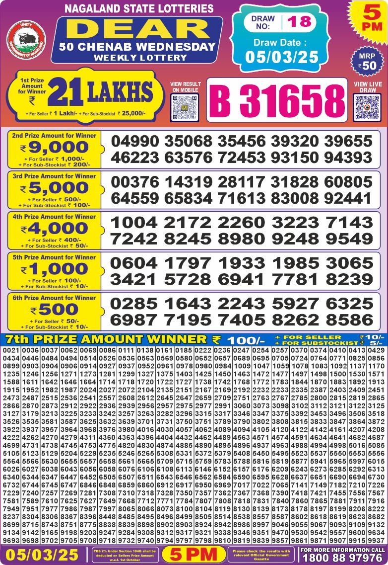 Dear 50 Chenab 5pm Wednesday Lottery Result 23.07.2025