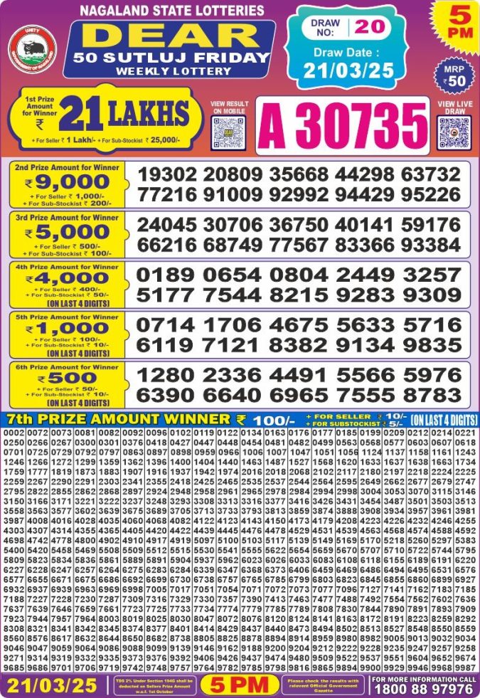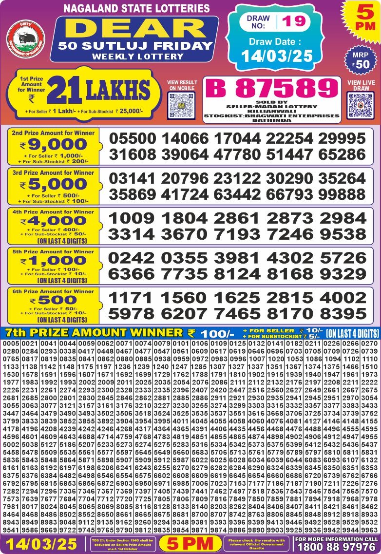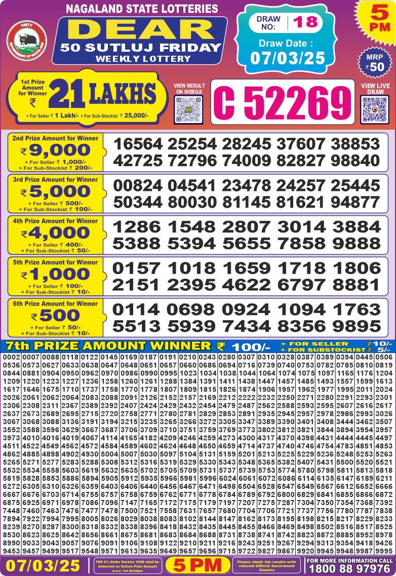 Dear 50 satluj Friday Lottery 5pm Result 18.07.2025
