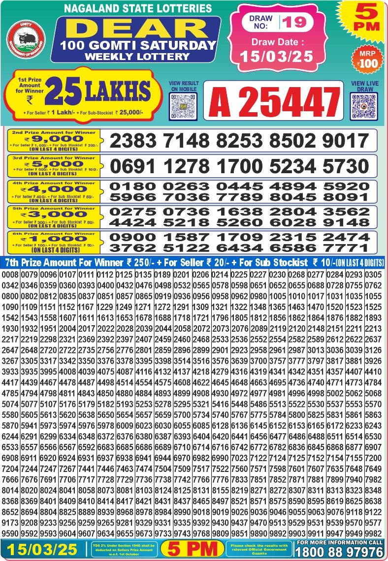 Dear 100 Gomti saturday Lottery 5pm Result  19.07.2025
