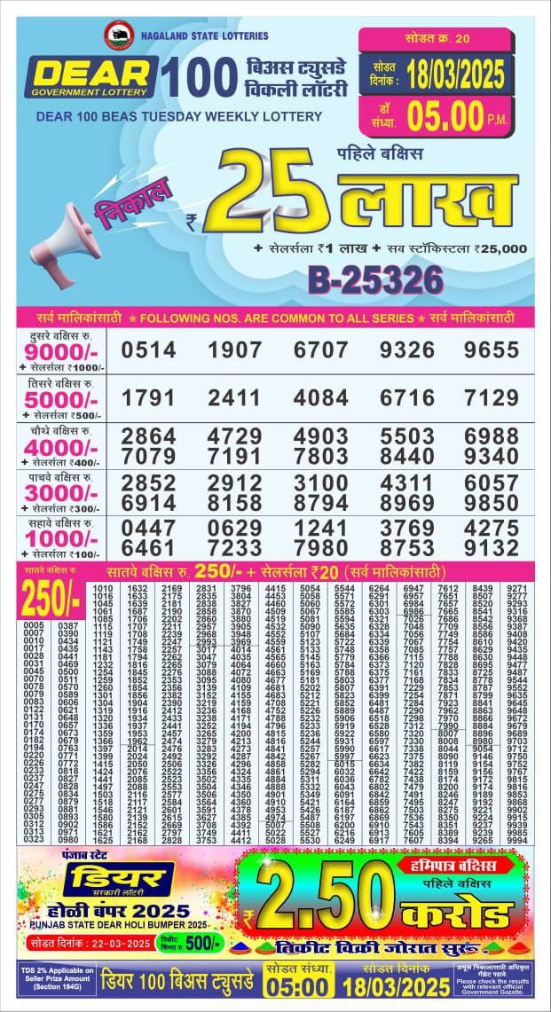 Dear 100 beas tuesday Lottery 5pm Result  15.07.2025
