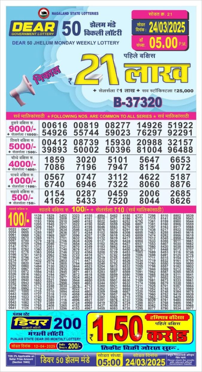 Dear 50 jhelum monday Lottery 5pm Result  23.06.2025