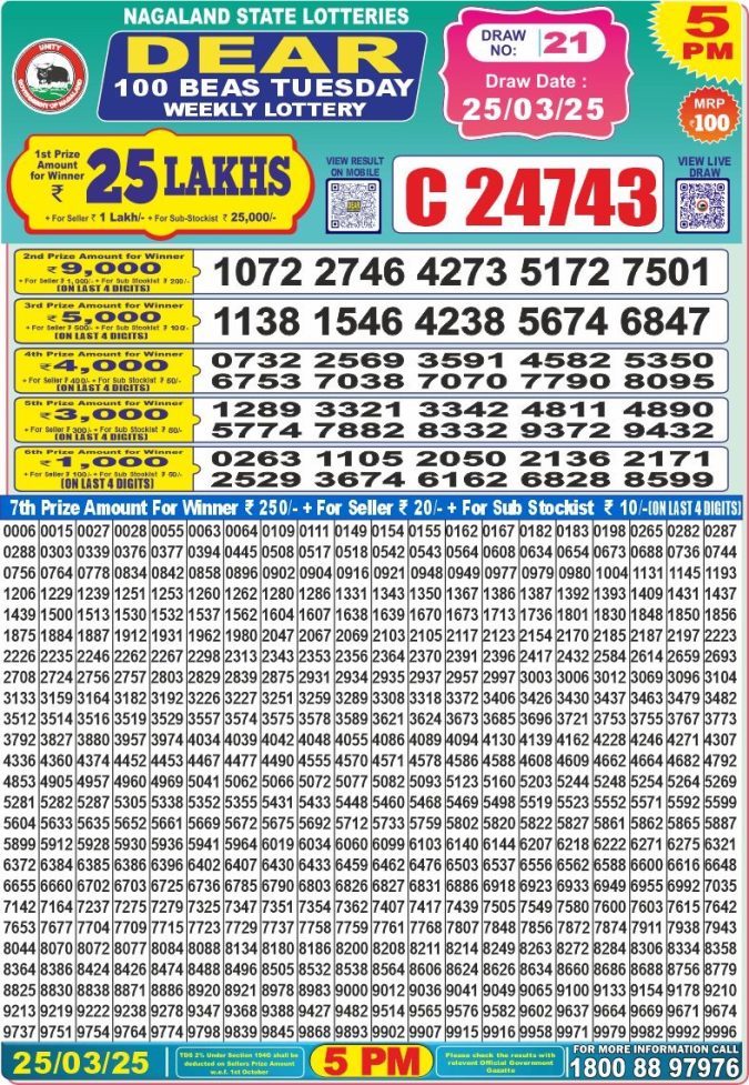 Dear 100 beas tuesday Lottery 5pm Result  27.05.25
