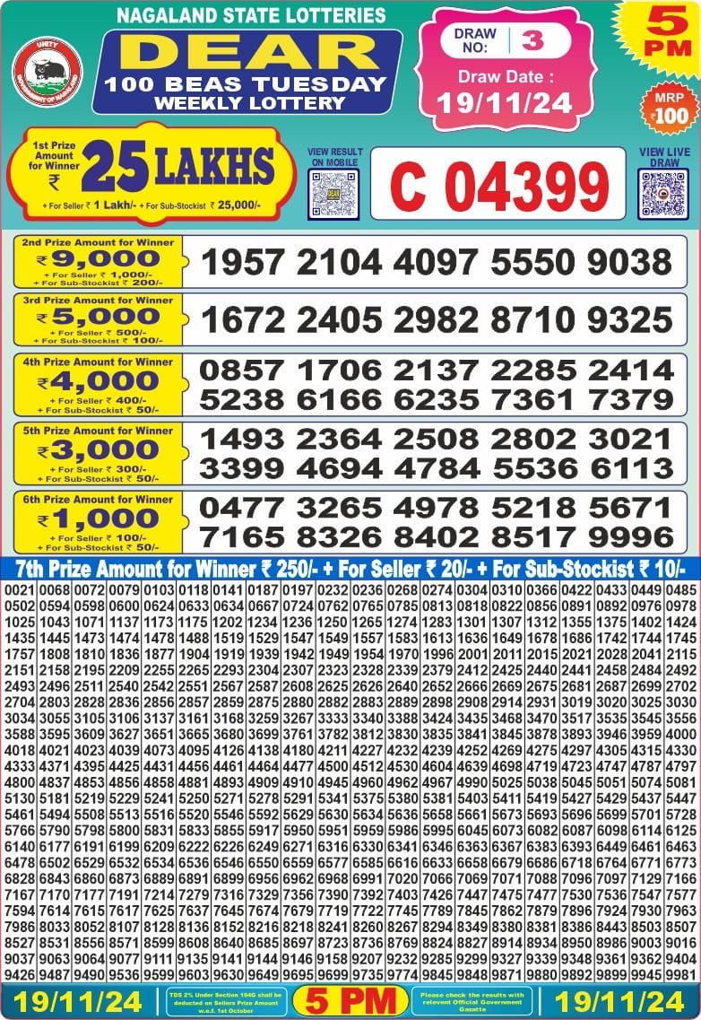 Dear 100 beas tuesday Lottery 5pm Result  11.3.25