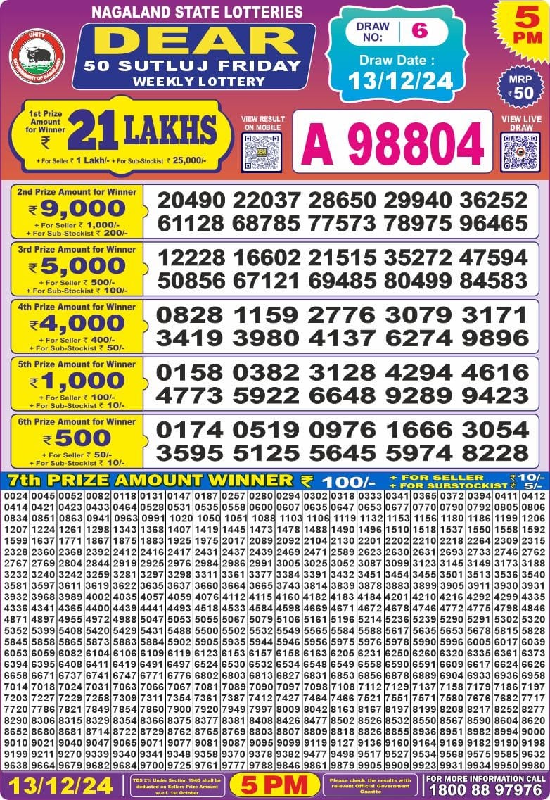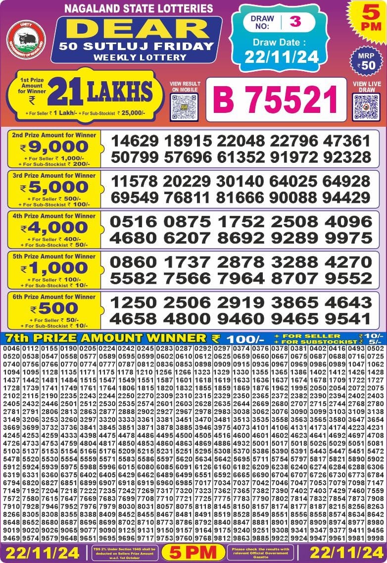 Dear 50 satluj Friday Lottery 5pm Result 7.3.25