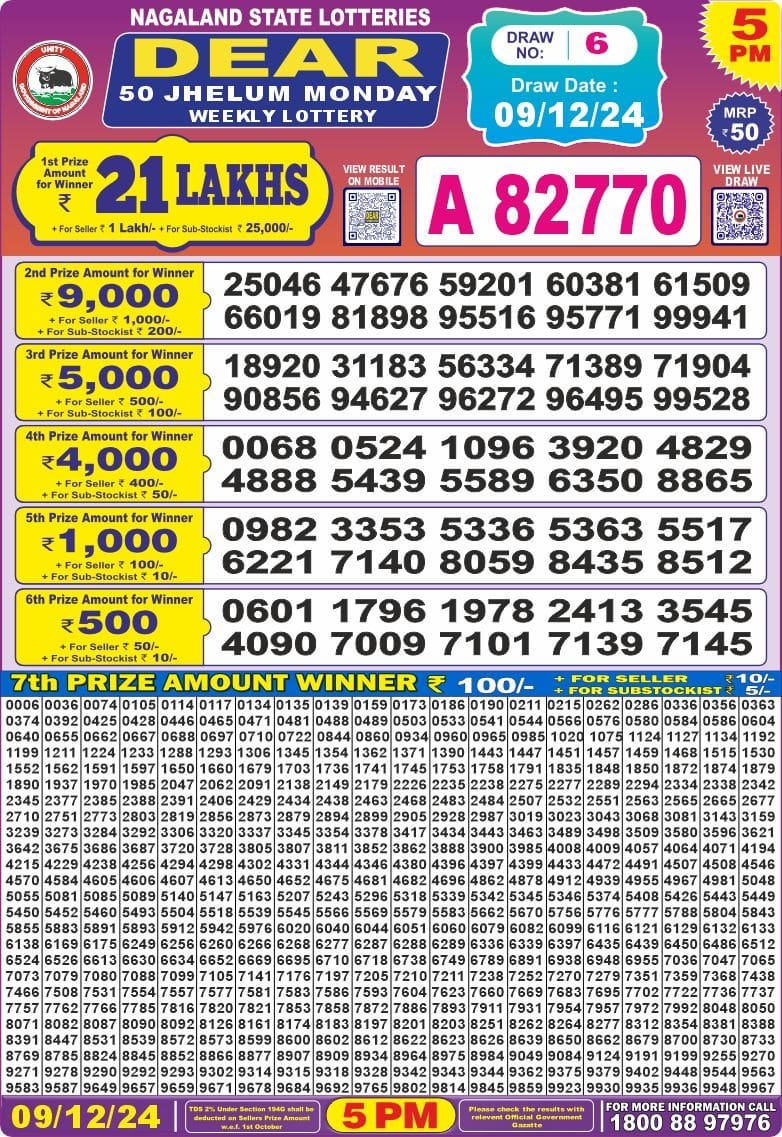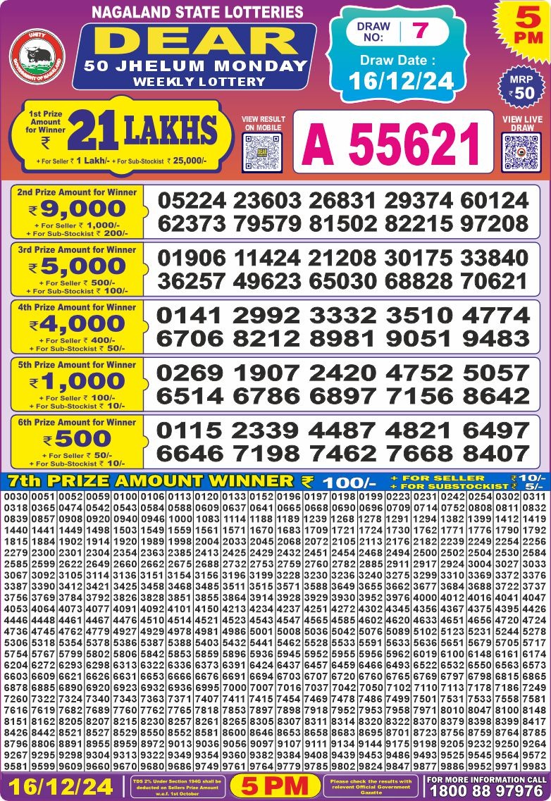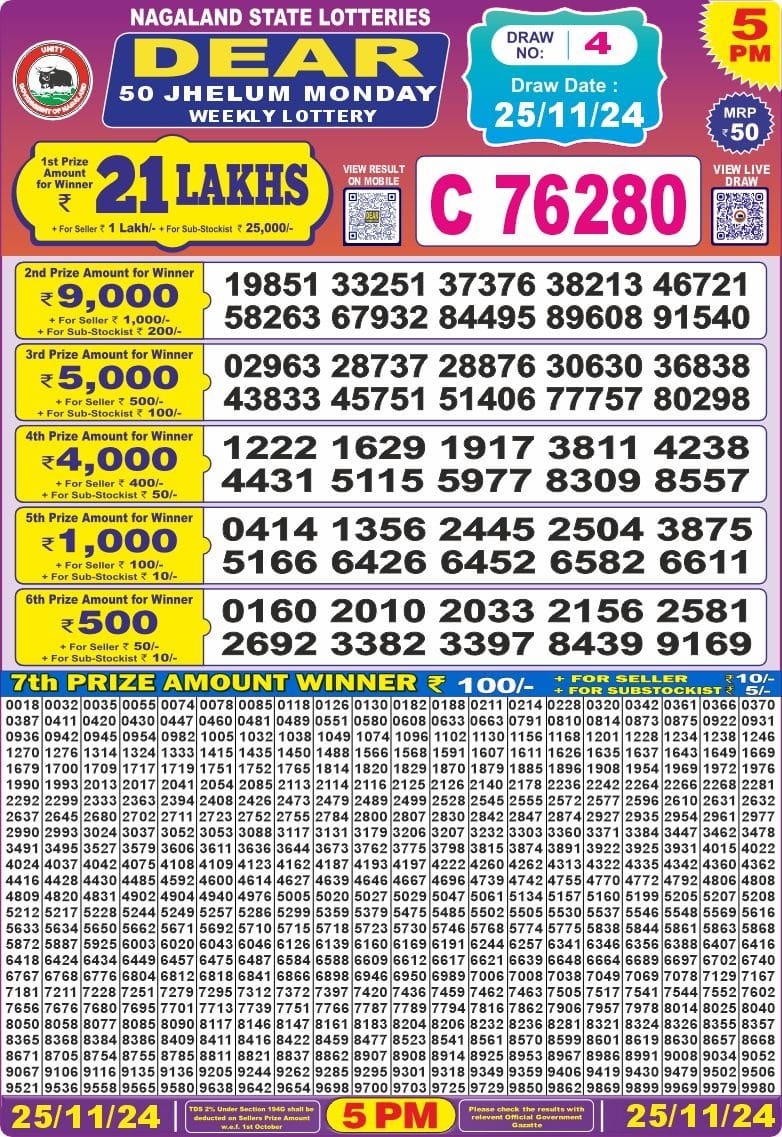 Dear 50 jhelum monday Lottery 5pm Result  10.3.25