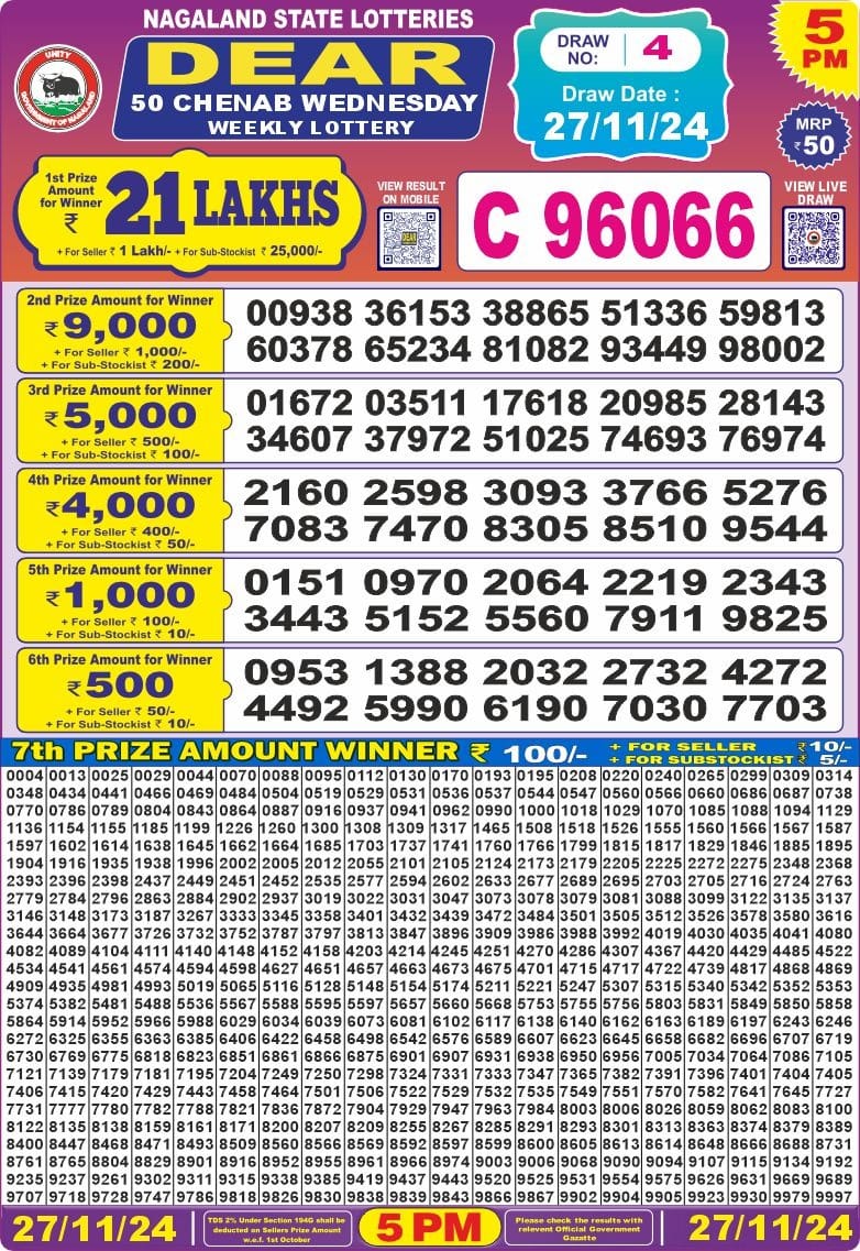 Dear 50 Chenab 5pm Wednesday Lottery Result 19.3.25