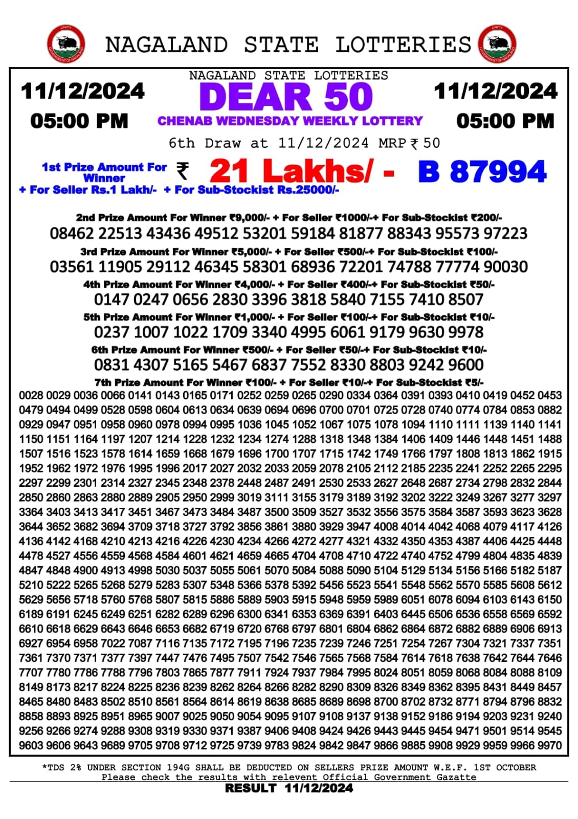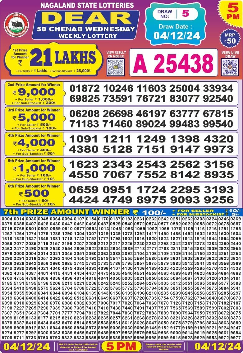 Dear 50 Chenab 5pm Wednesday Lottery Result 12.3.25