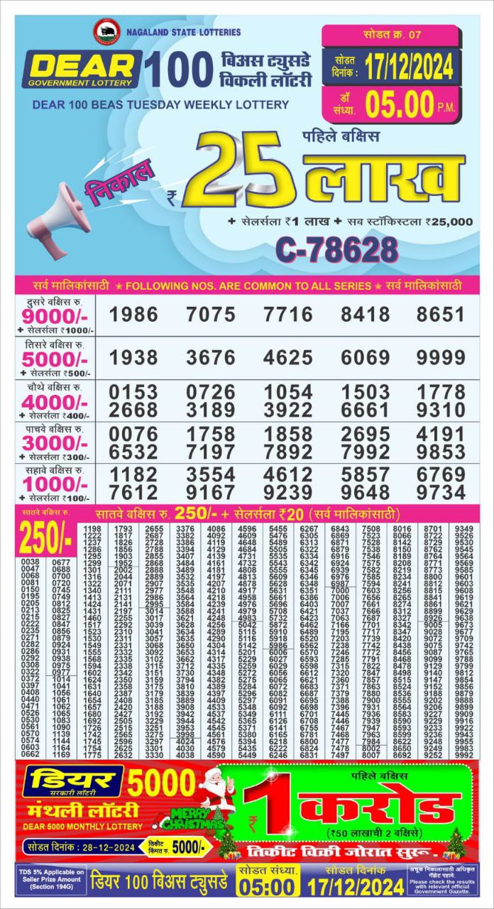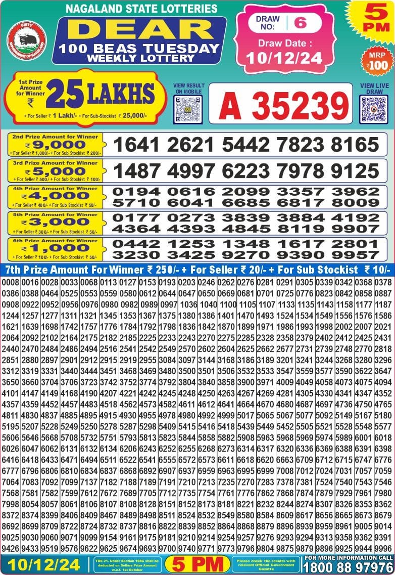 Dear 100 beas tuesday Lottery 5pm Result  18.3.25