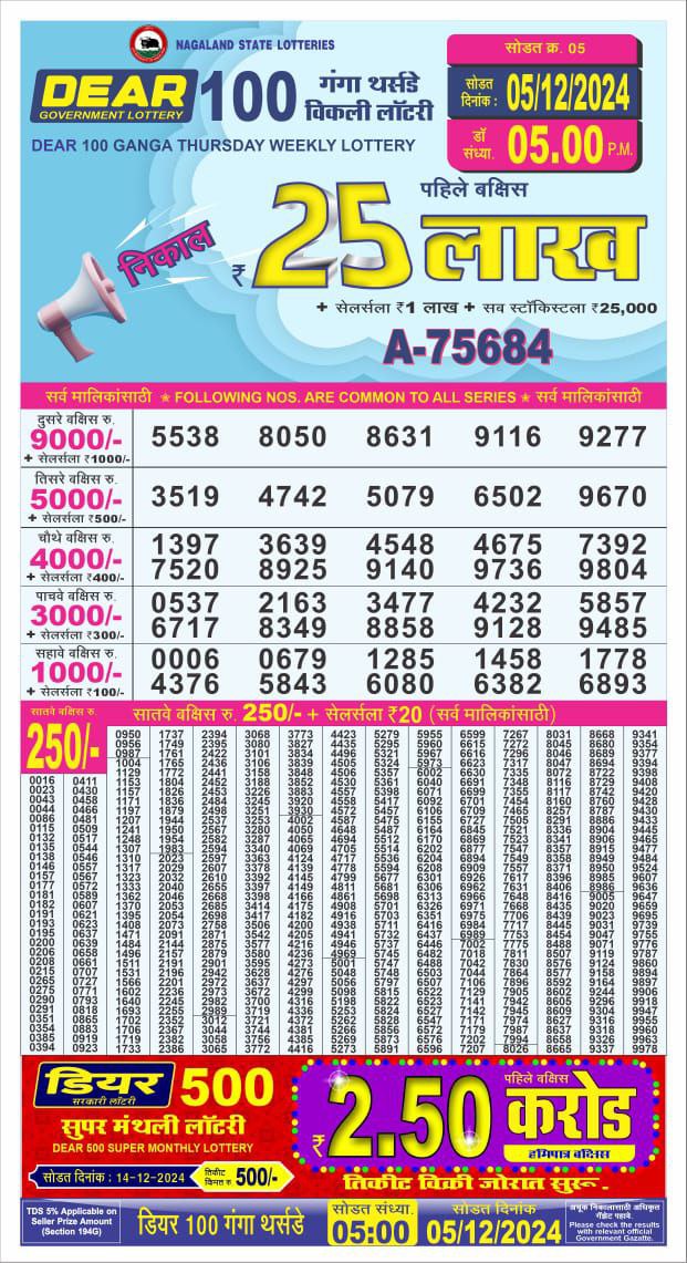 Dear 100 Ganga Thursday Lottery 5pm Result  27.2.25