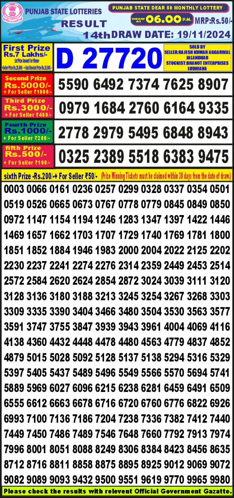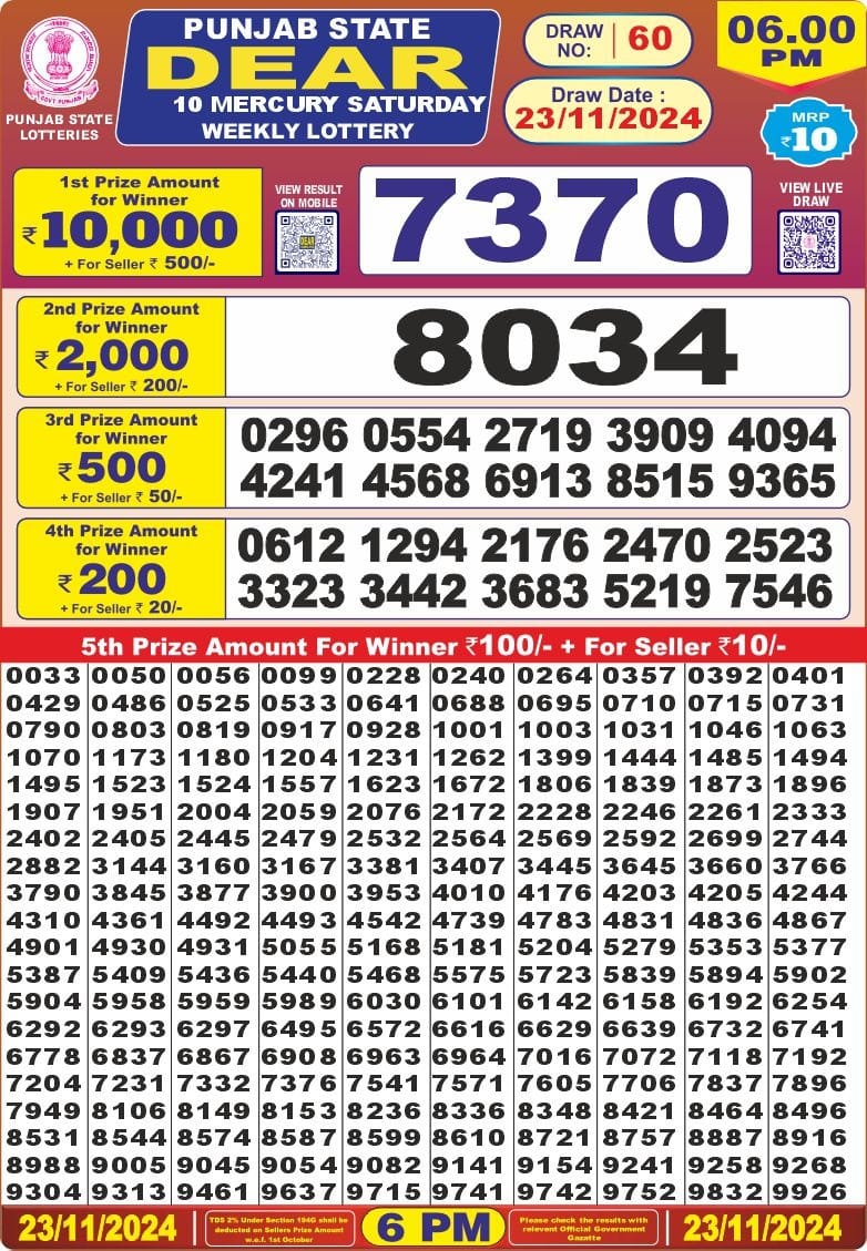 Punjab state dear 10 6pm lottery result 07.07.2025