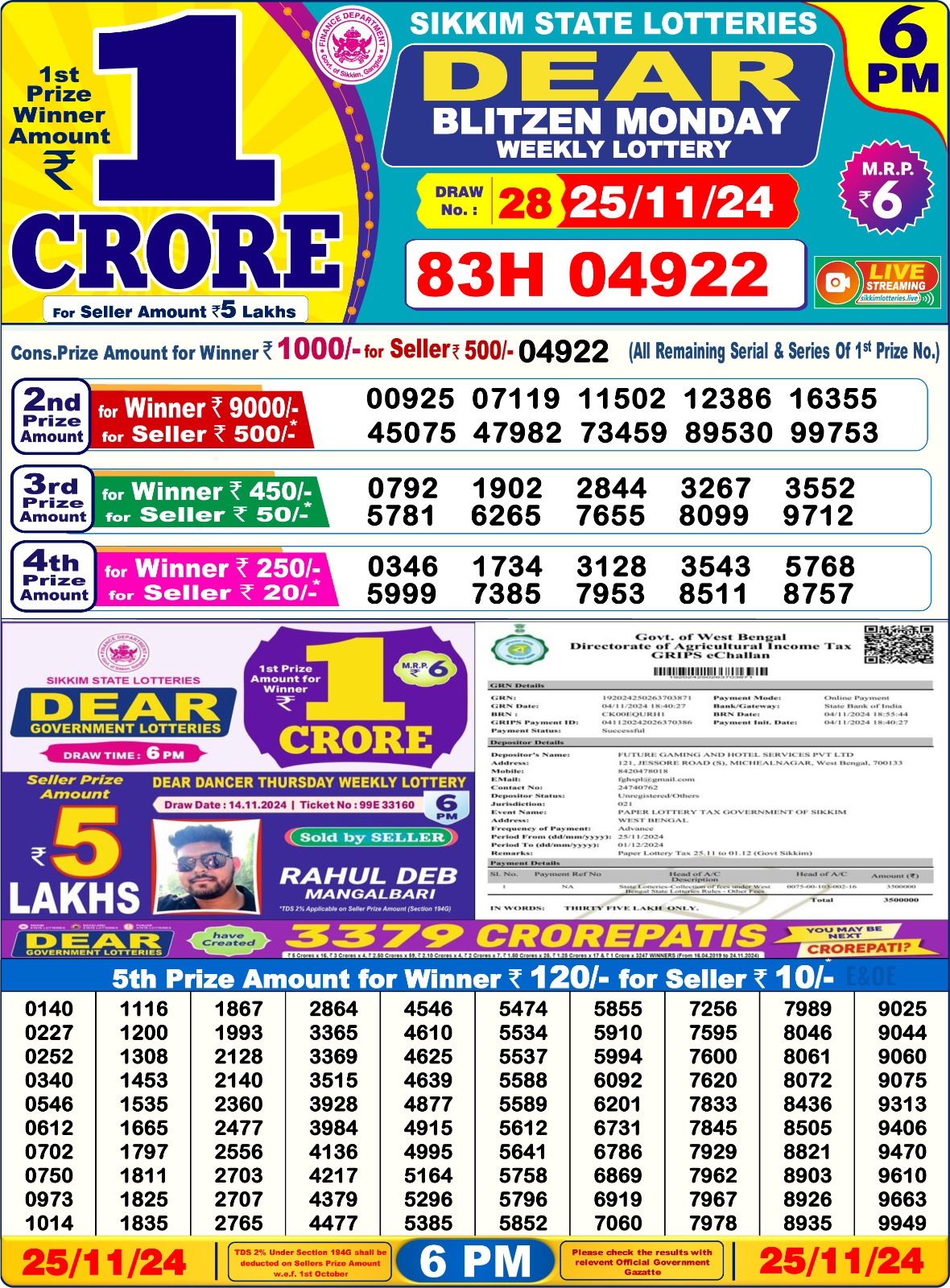 Dear blitzen monday weekly 6PM Result 07.07.2025