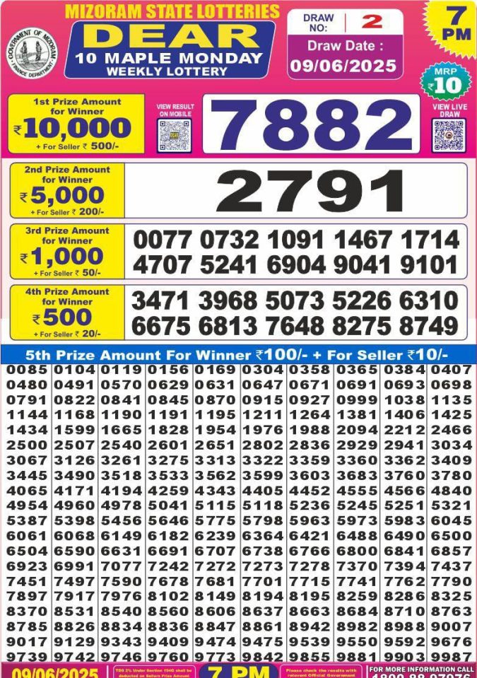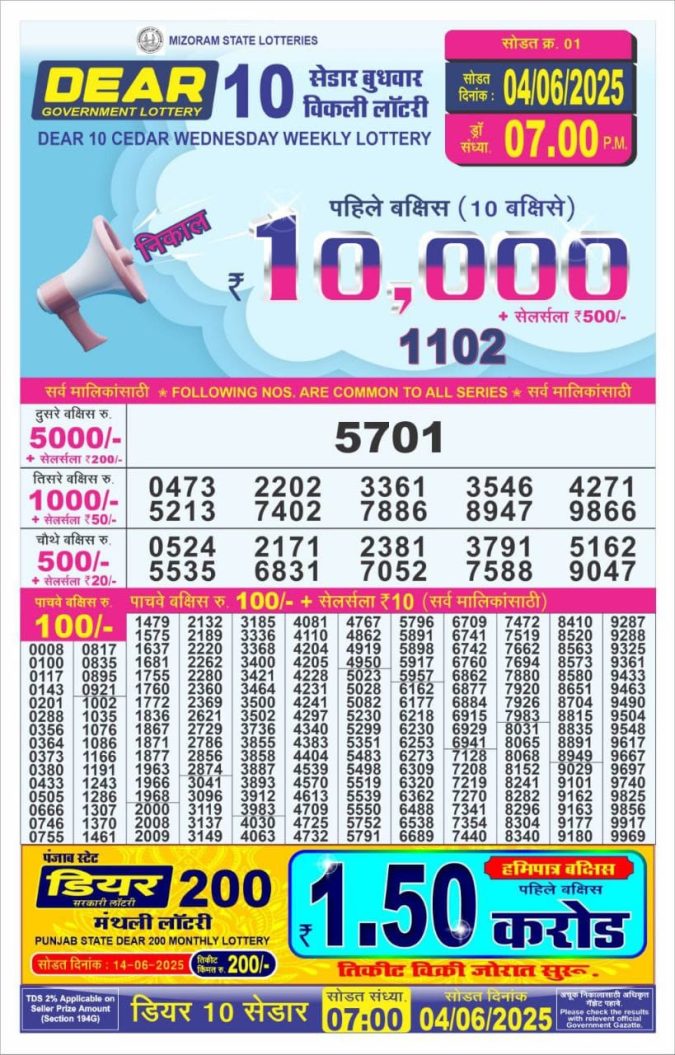 Dear 10 Cedar 7pm Lottery Result 10.09.2025
