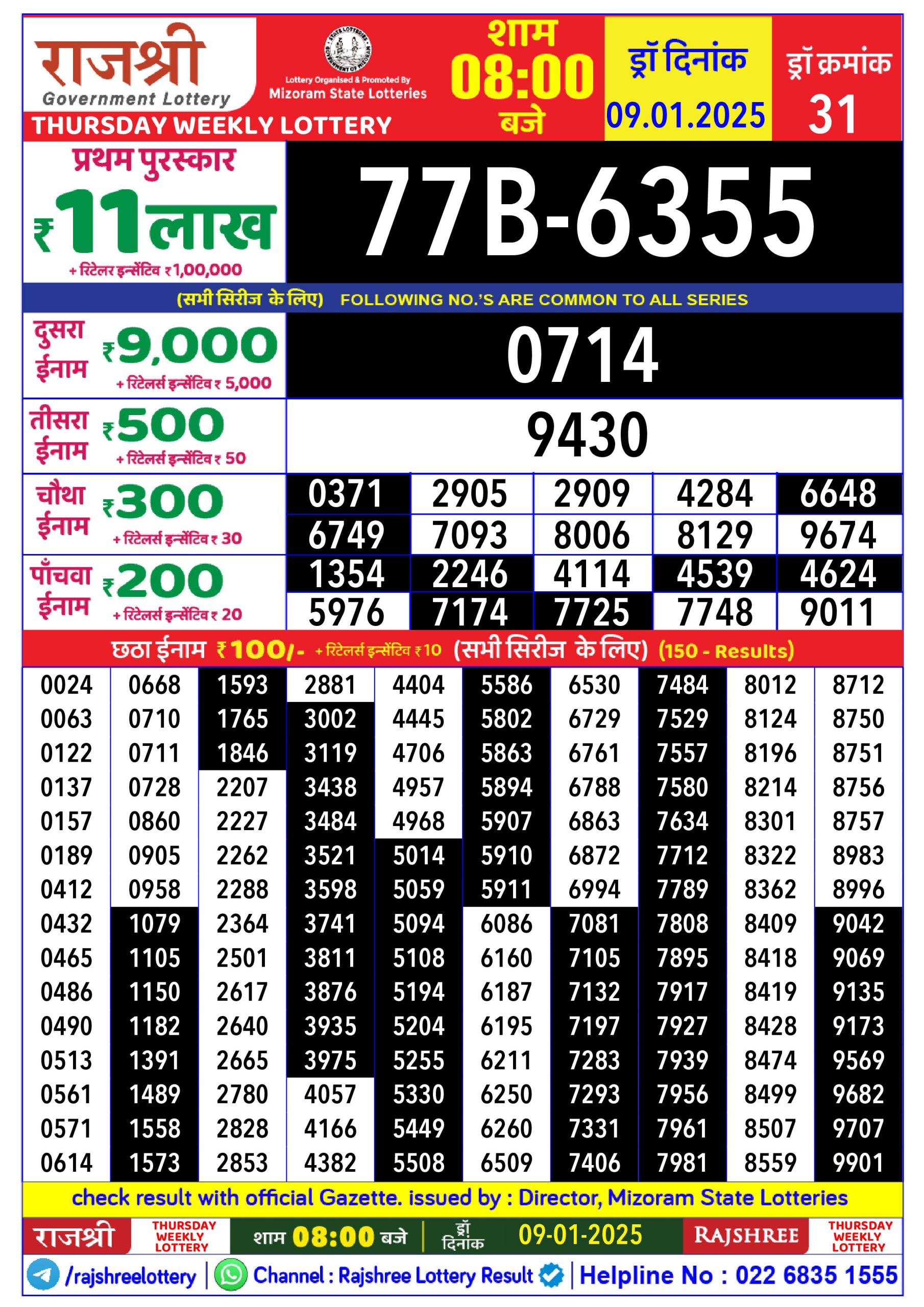 Rajshree Weekly Lottery 8PM Result 1.1.25