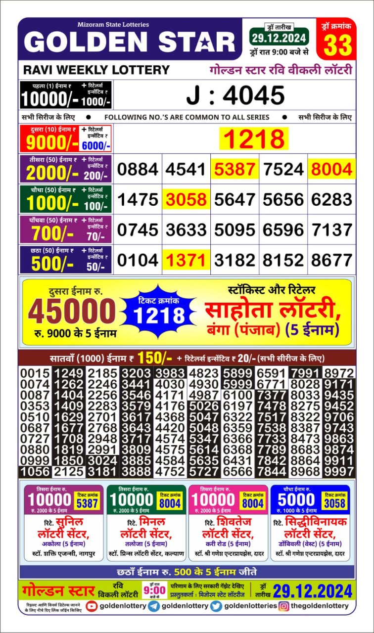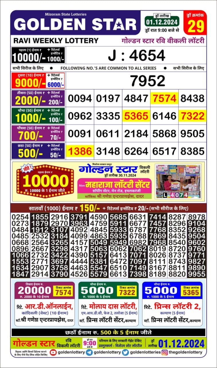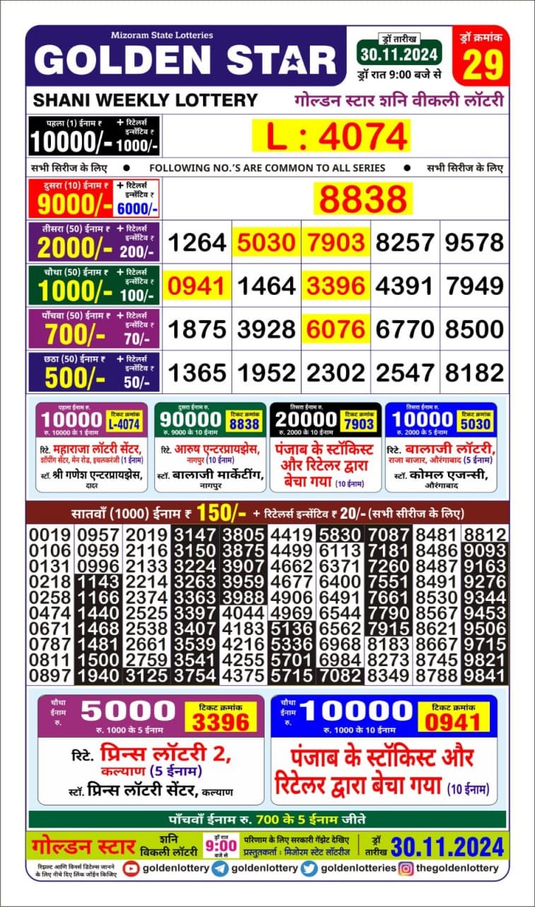 Golden Star Weekly Lottery Result 9pm 29.09.2025