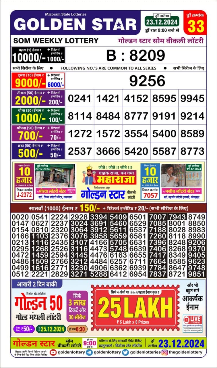 Golden Star Weekly Lottery Result 9pm 23.09.2025