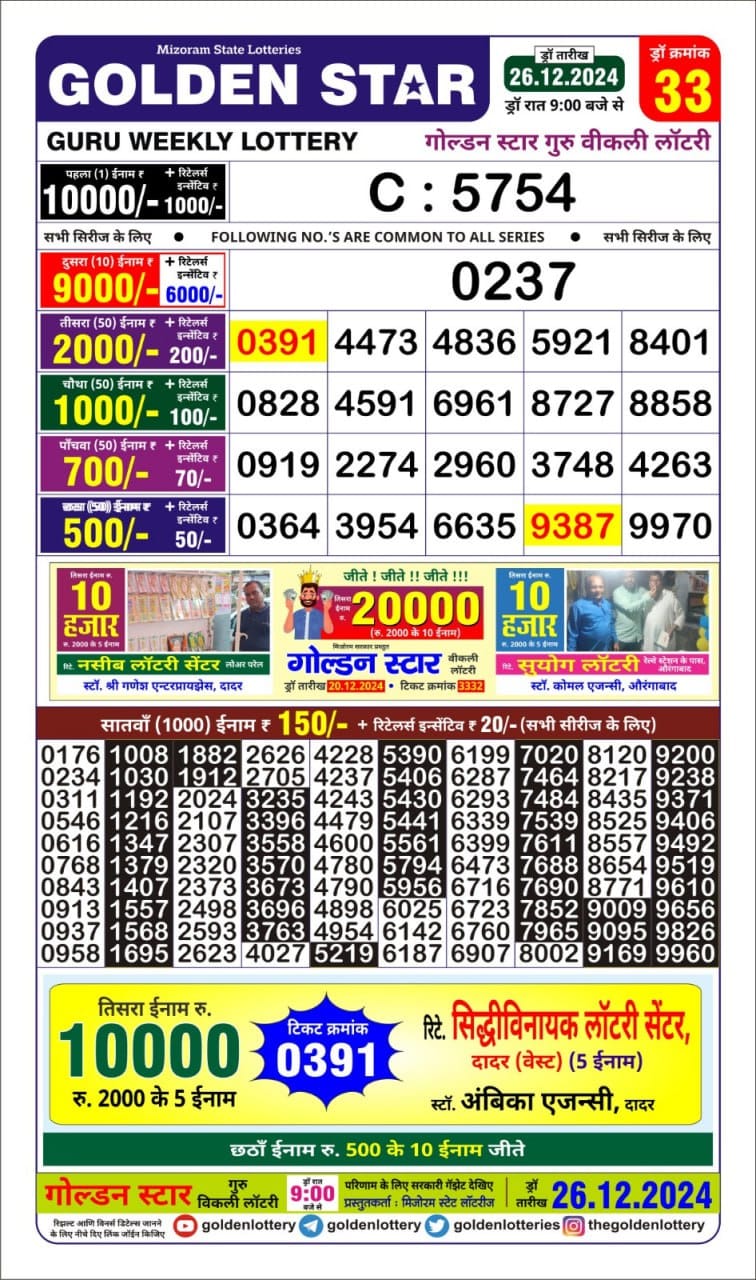 Golden Star Weekly Lottery Result 9pm 26.09.2025