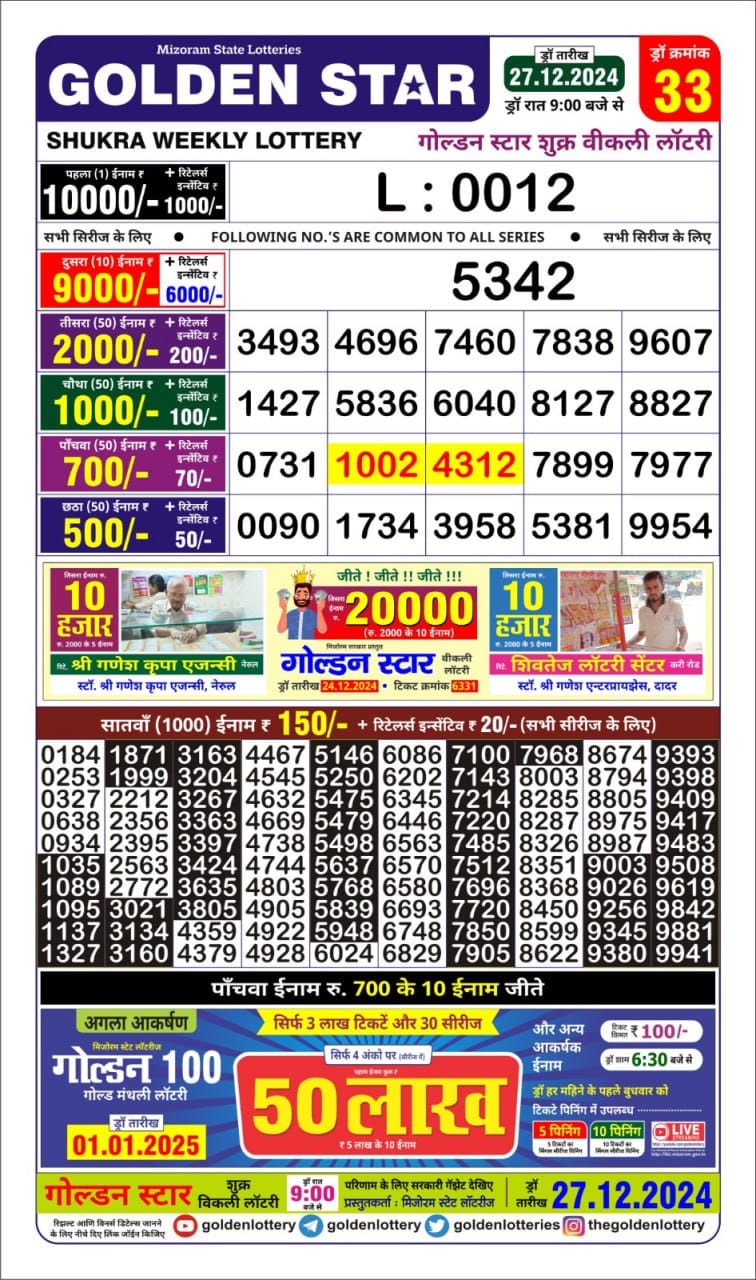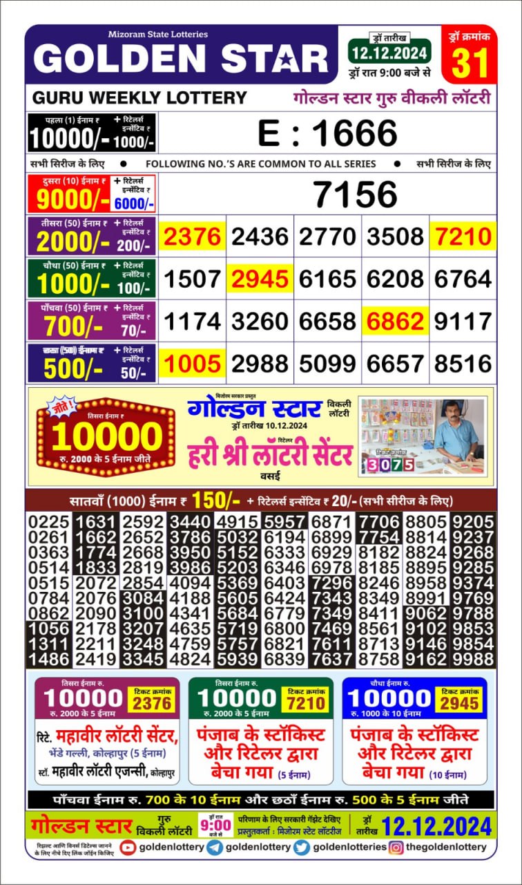 Golden Star Weekly Lottery Result 9pm 12.10.2025