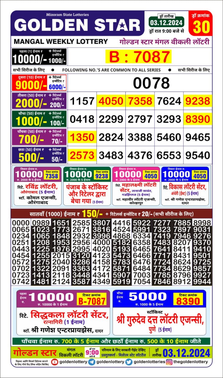 Golden Star Weekly Lottery Result 9pm 30.09.2025