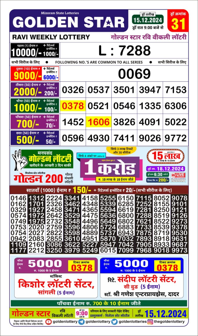 Golden Star Weekly Lottery Result 9pm 15.09.2025