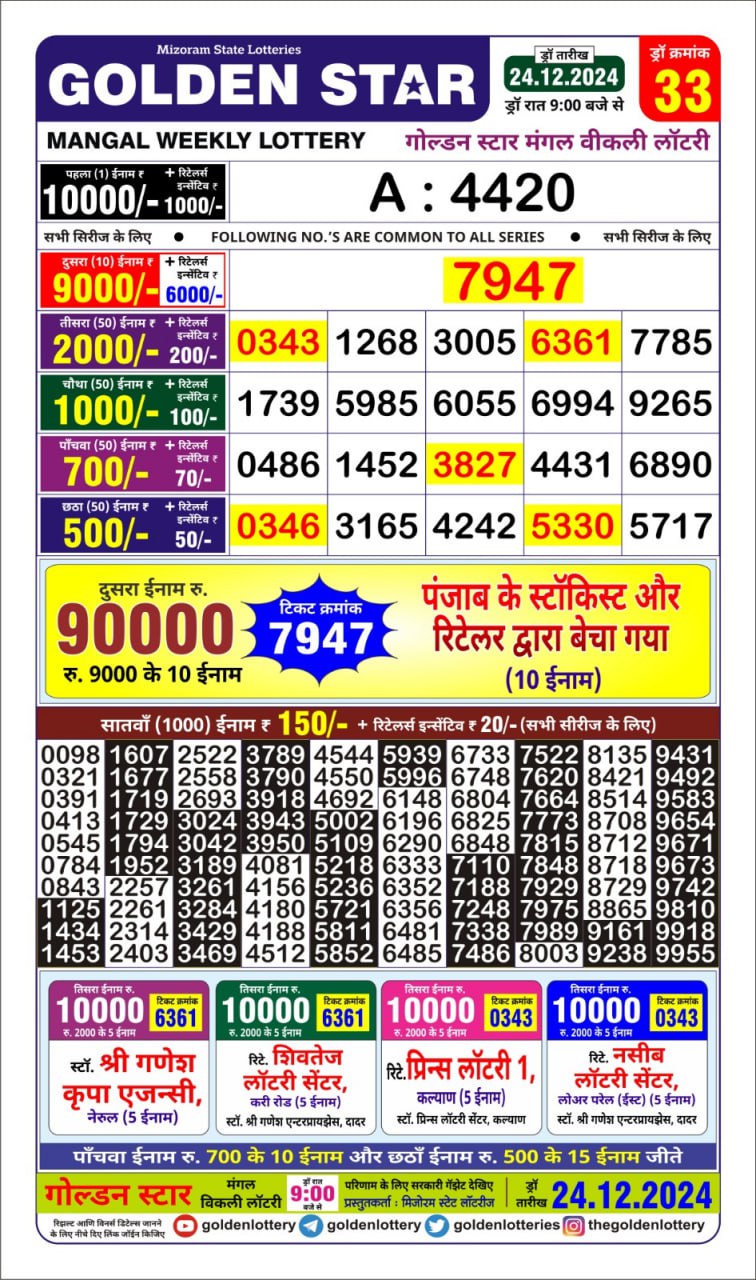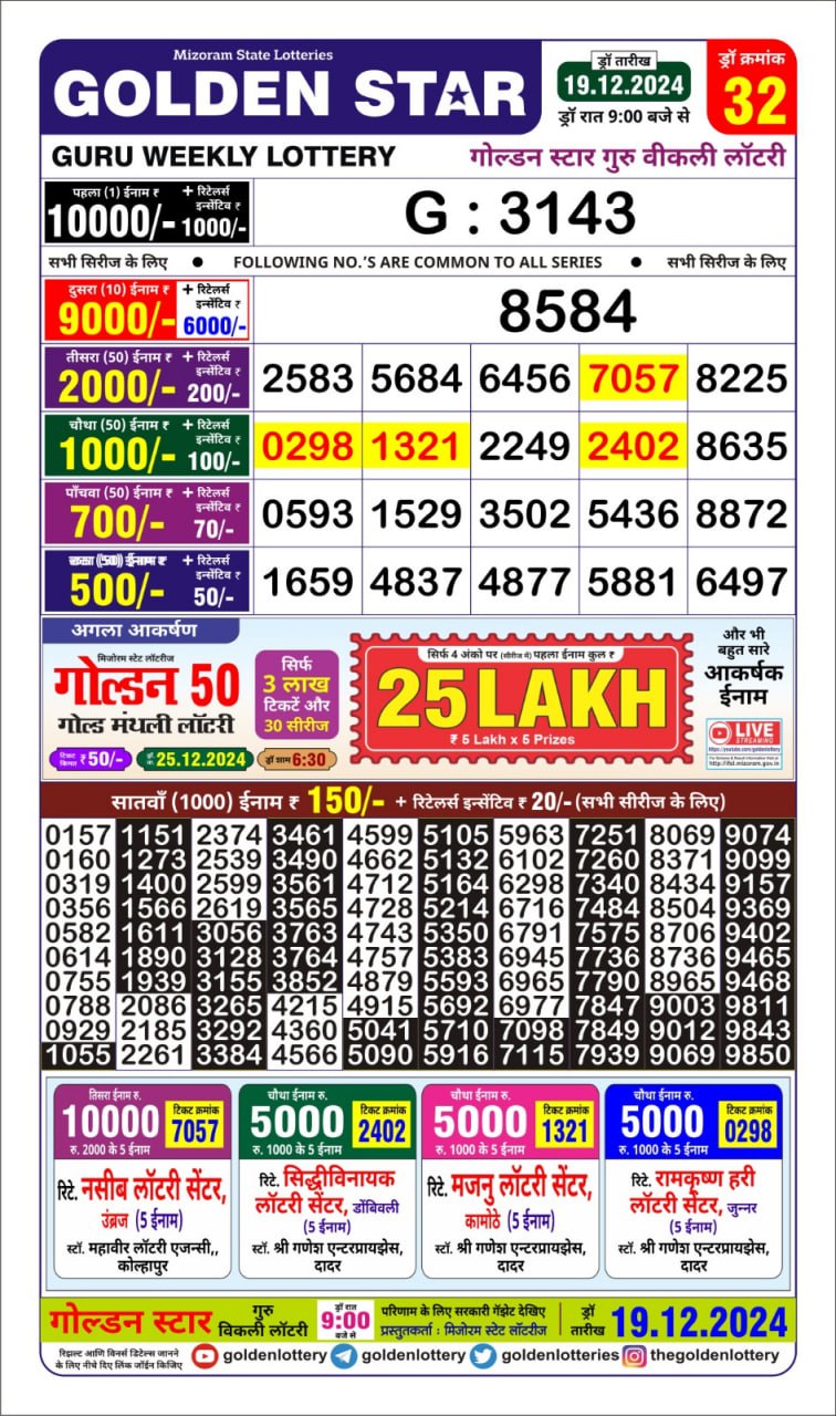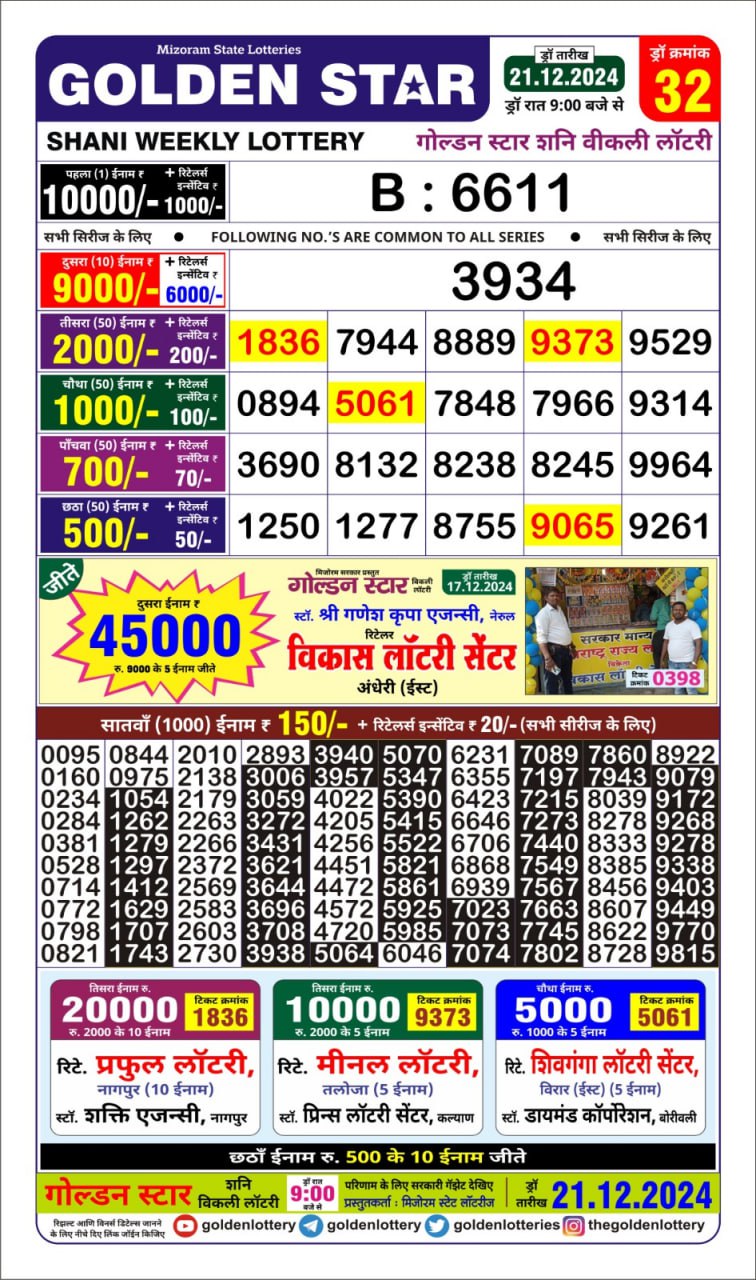 Golden Star Weekly Lottery Result 9pm 19.09.2025