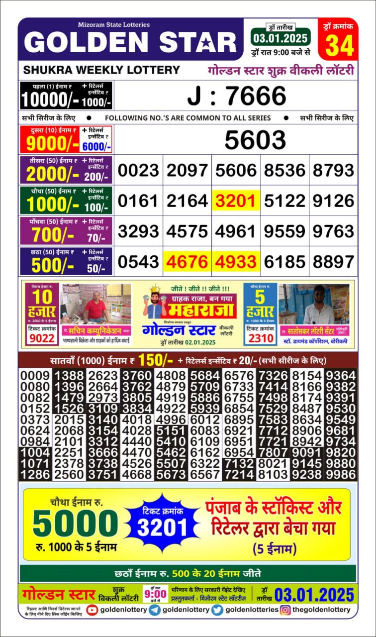 Golden Star Weekly Lottery Result 9pm 03.10.2025