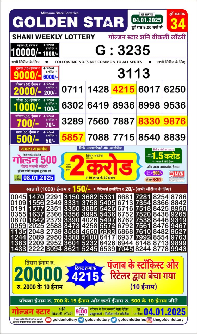 Golden Star Weekly Lottery Result 9pm 04.10.2025
