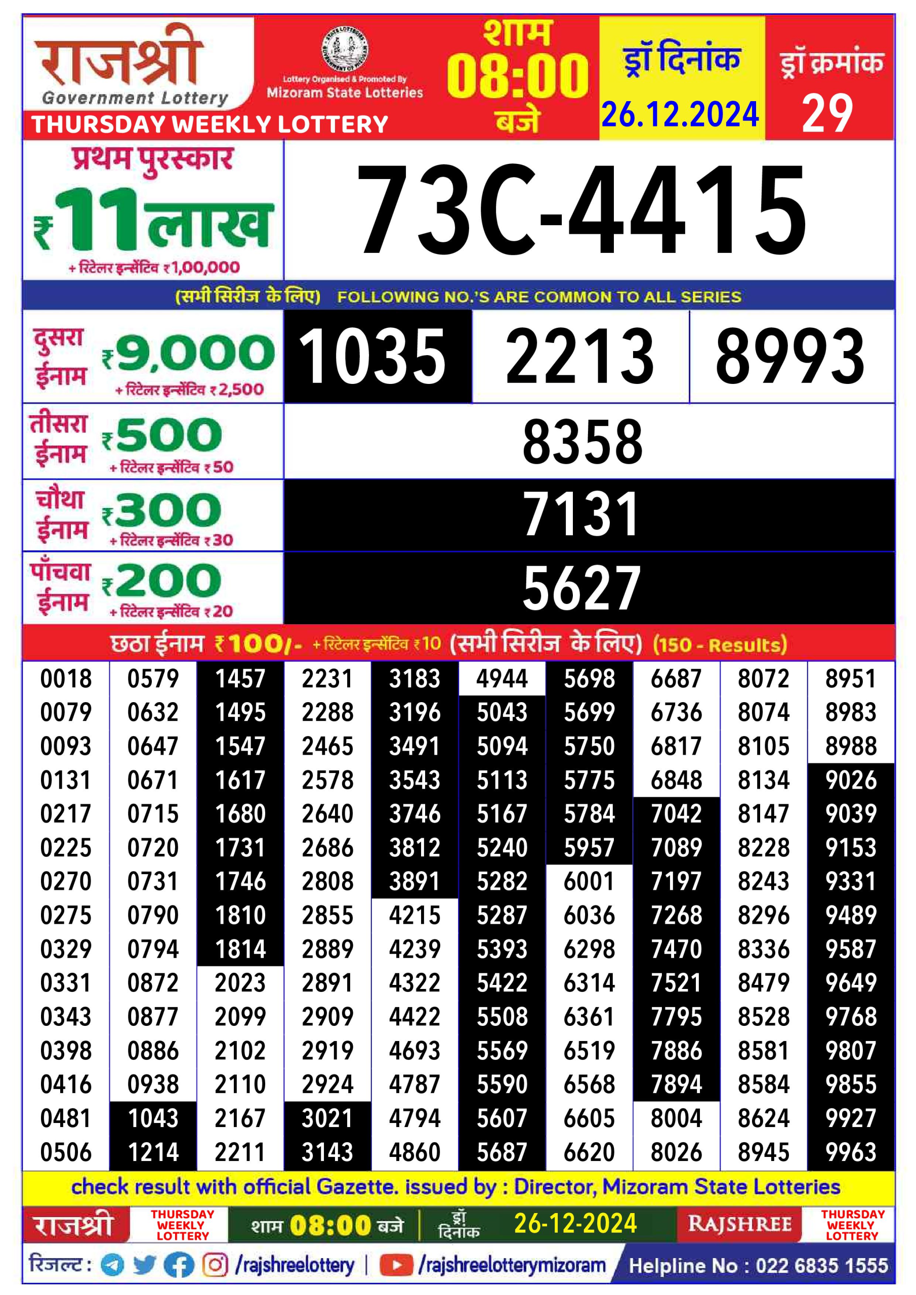 Rajshree Thursday Weekly Lottery 8PM Result 26.12.24