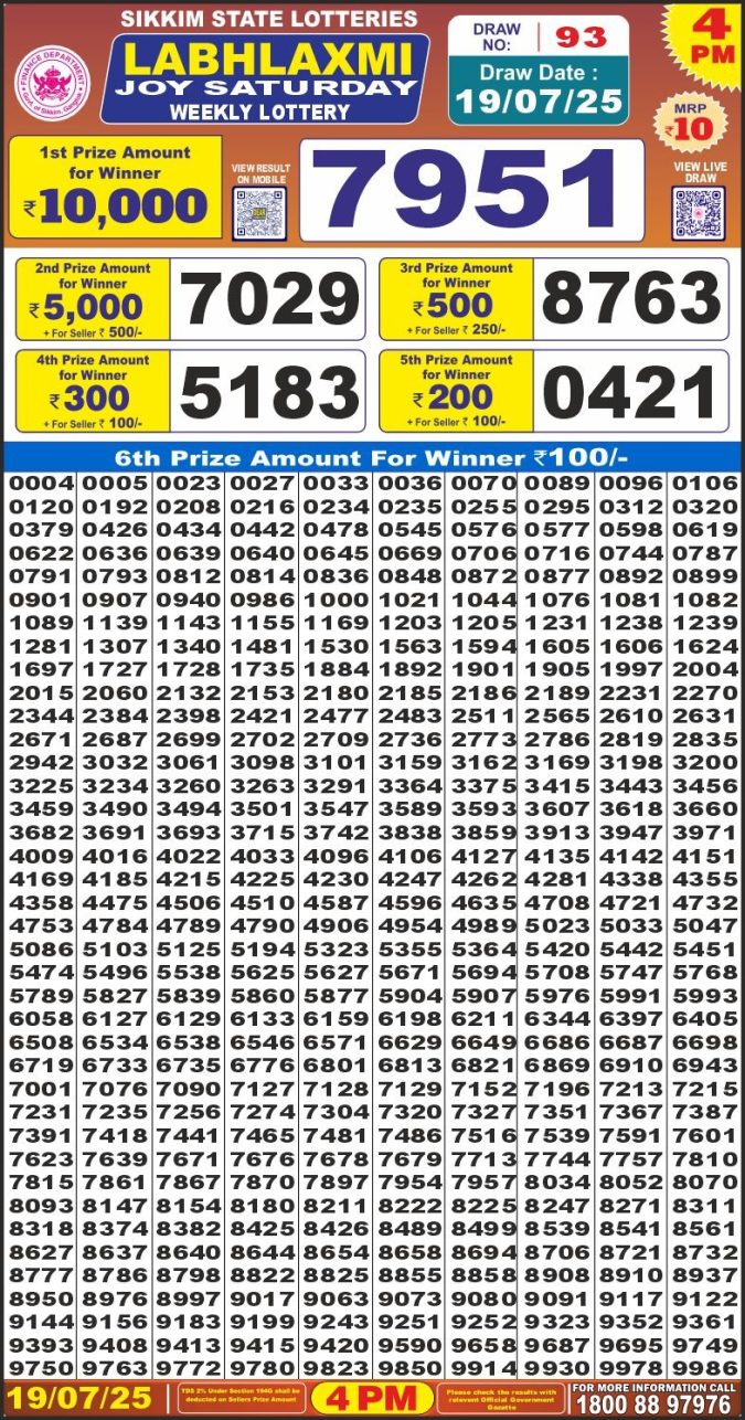 LabhLaxmi joy weekly 4PM Result 19.07.2025