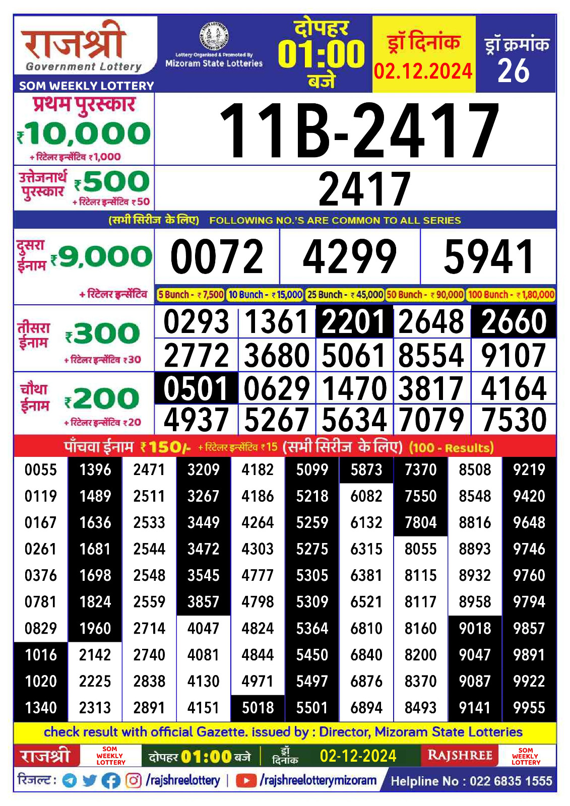 Rajshree Budh Weekly Lottery 1PM Result 02.07.2025