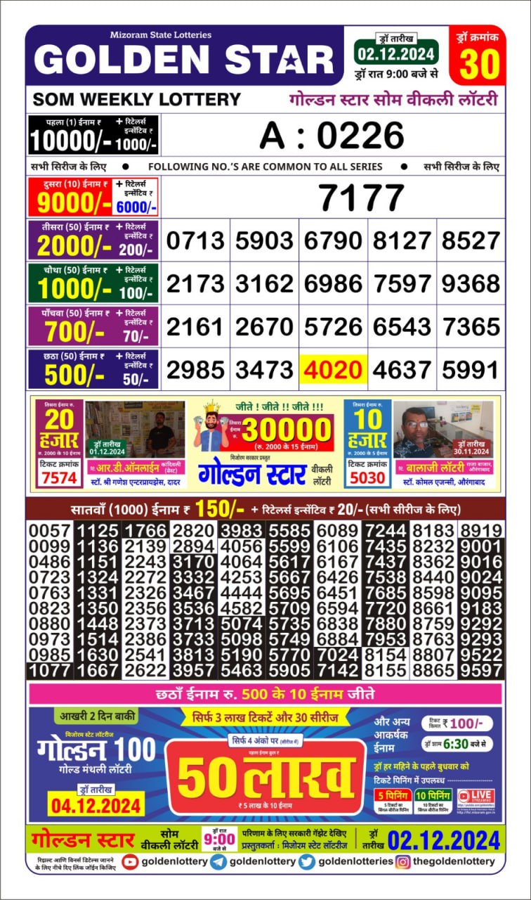 Golden Star weekly Lottery result 9pm 30.06.2025