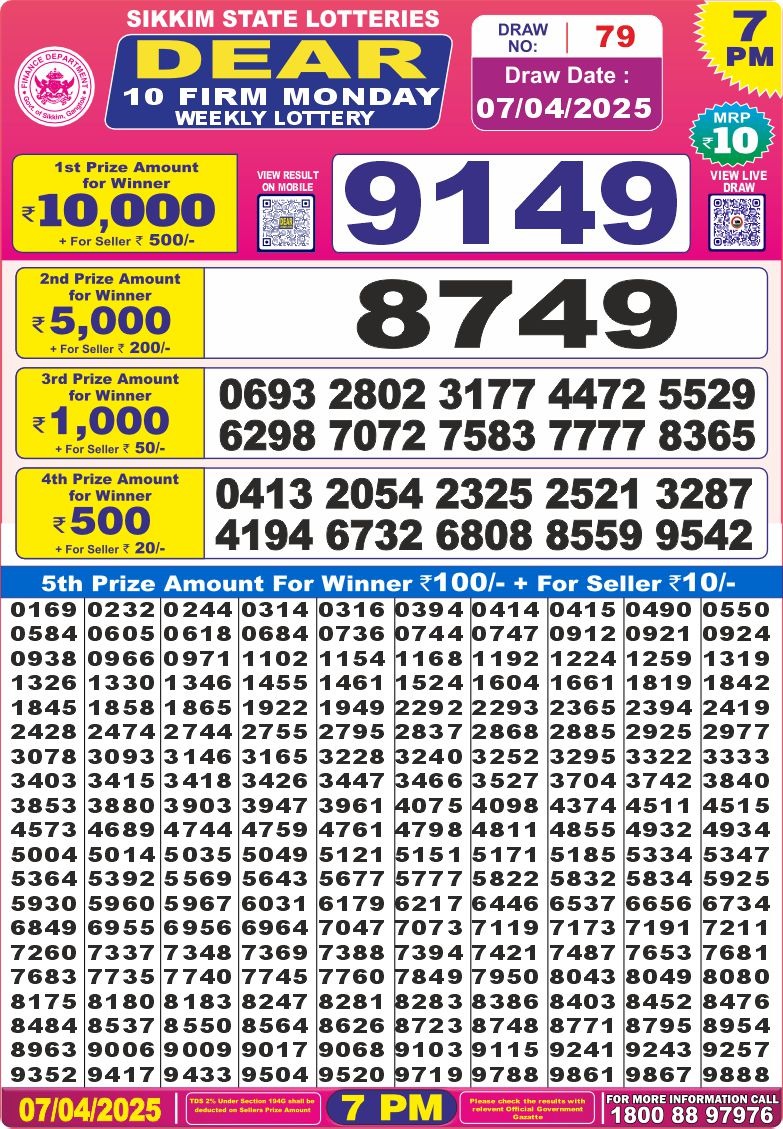 Nagaland State Lotteries was established in the year 1972 under the supervision of the Finance Department to generate a dependable source of revenue for the State Government. Nagaland State Lottery is held every day of the week at three different times of the day, Morning, Day, and Evening. Every day, the lottery is held under a different name with some difference in the prize money with the top prize worth ₹1 Crore (including Super Prize amount). The daily lotteries hosted by Nagaland State include Dear Morning Lottery, Dear Day Lottery, and Dear Evening Lottery which costs 6 Rupees for each ticket.