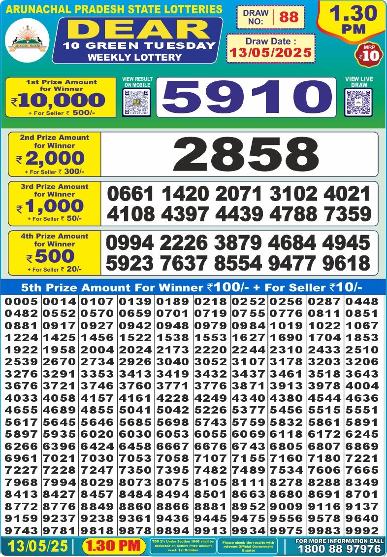 Dear 10 green lottery 1.30PM Result 13.5.25