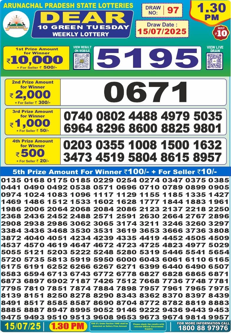 Dear 10 green lottery 1.30PM Result 15.07.2025