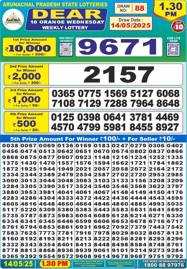 Dear 10 Orange Lottery 1.30PM Result 14.5.2025