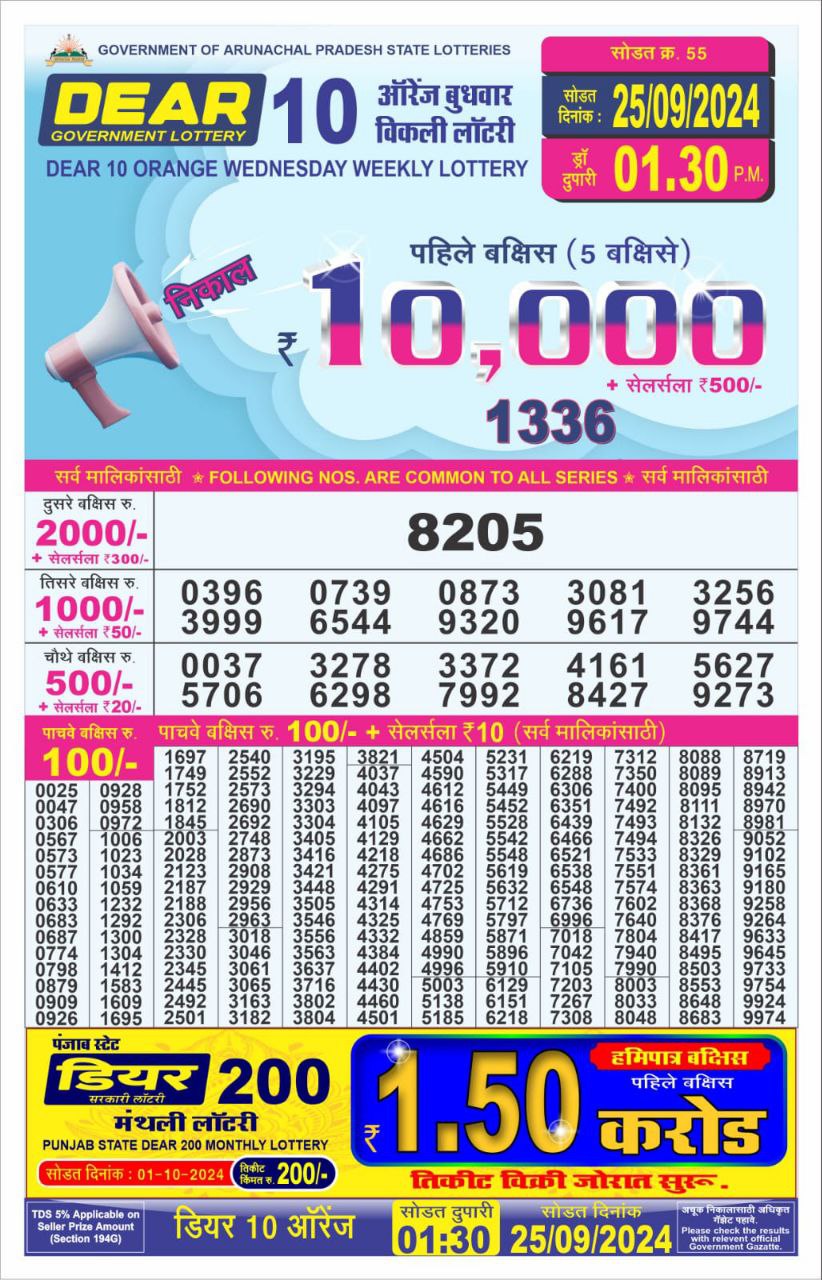 Dear 10 orange lottery 1.30PM Result 25/09/24