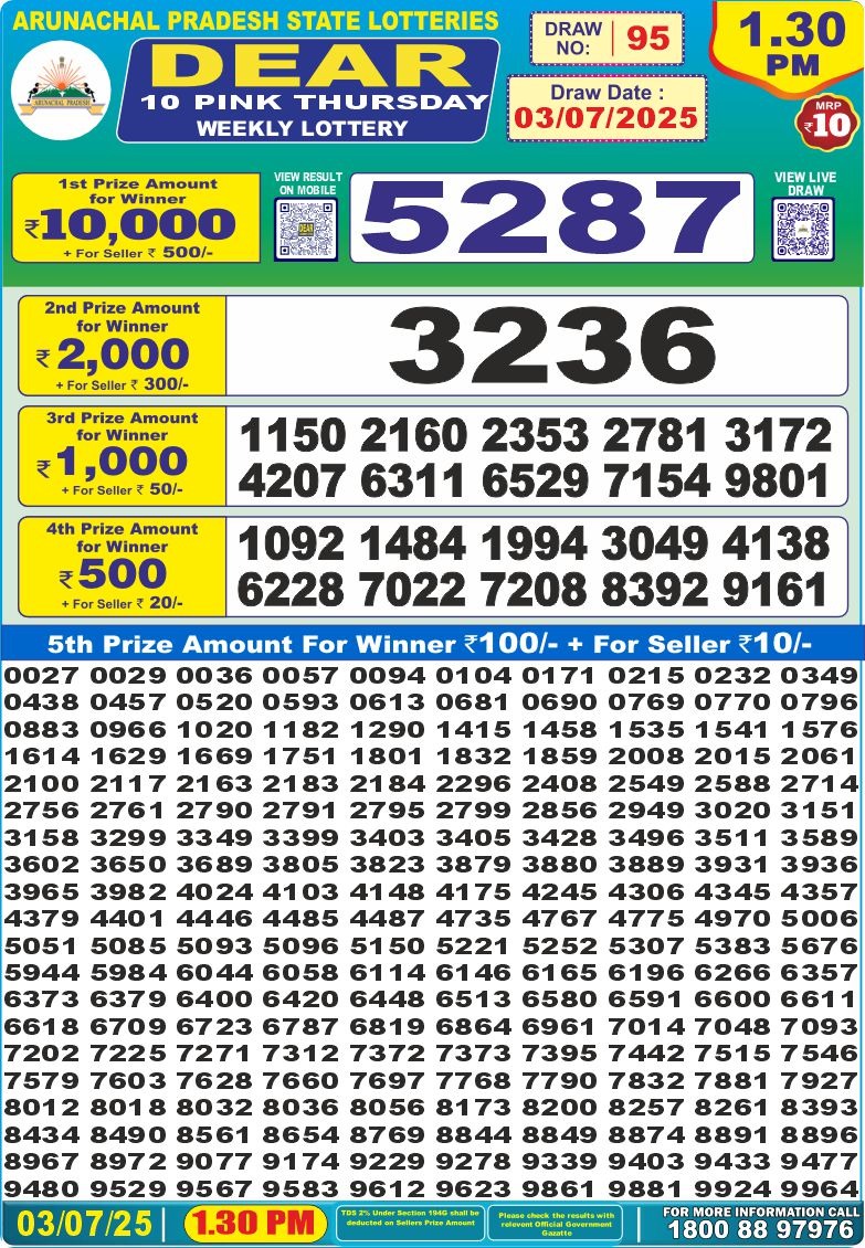 Dear 10 pink lottery 1.30PM Result 03.07.2025